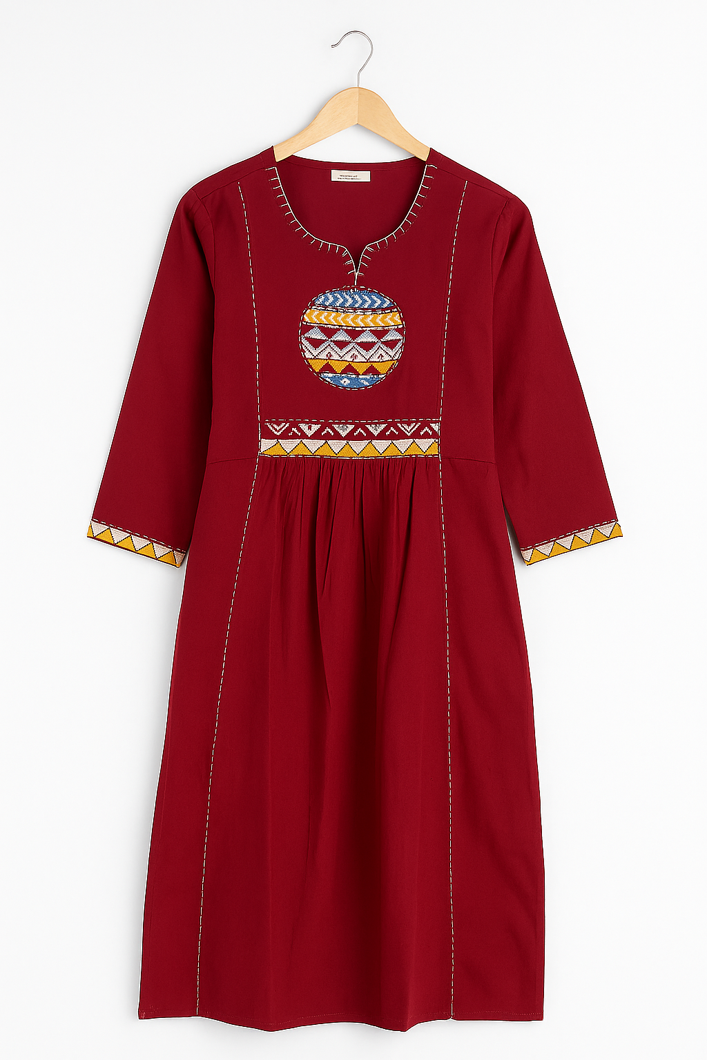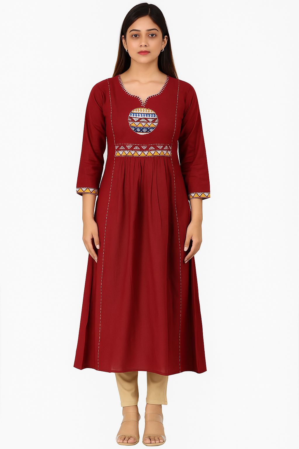 Add a pop of tradition to your wardrobe with this maroon cotton kurti by Natural Fab, featuring intricate tribal-inspired embroidery on the neckline and waist. Crafted from breathable, soft cotton, this kurti ensures all-day comfort with a flattering pleated silhouette and 3/4th sleeves. Perfect for festive gatherings, office wear, or casual outings — pair it with beige or contrast leggings for a timeless ethnic look.