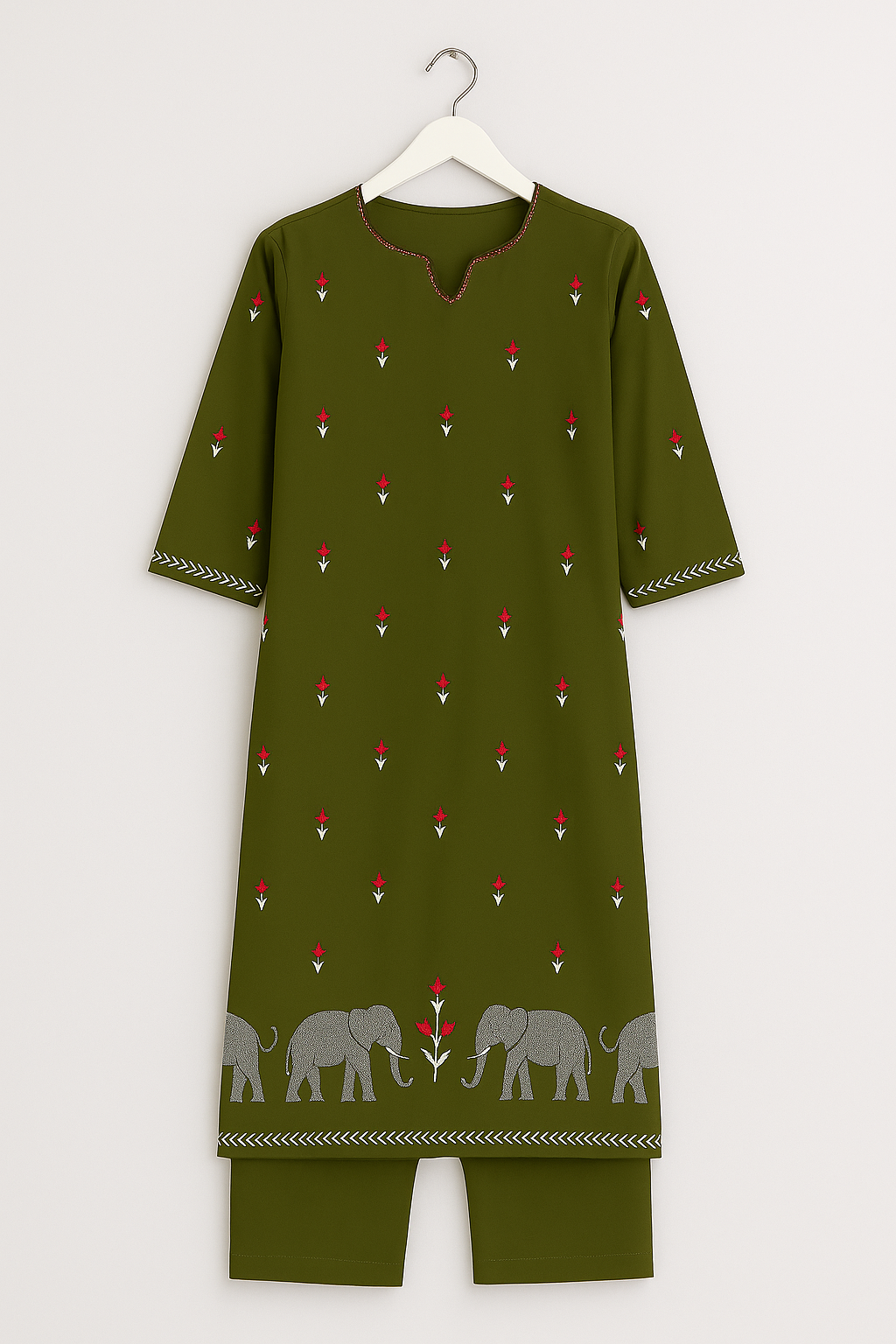 Elegant Olive Green Cotton Kurti Set with Elephant Embroidery | Ethnic Wear for Women