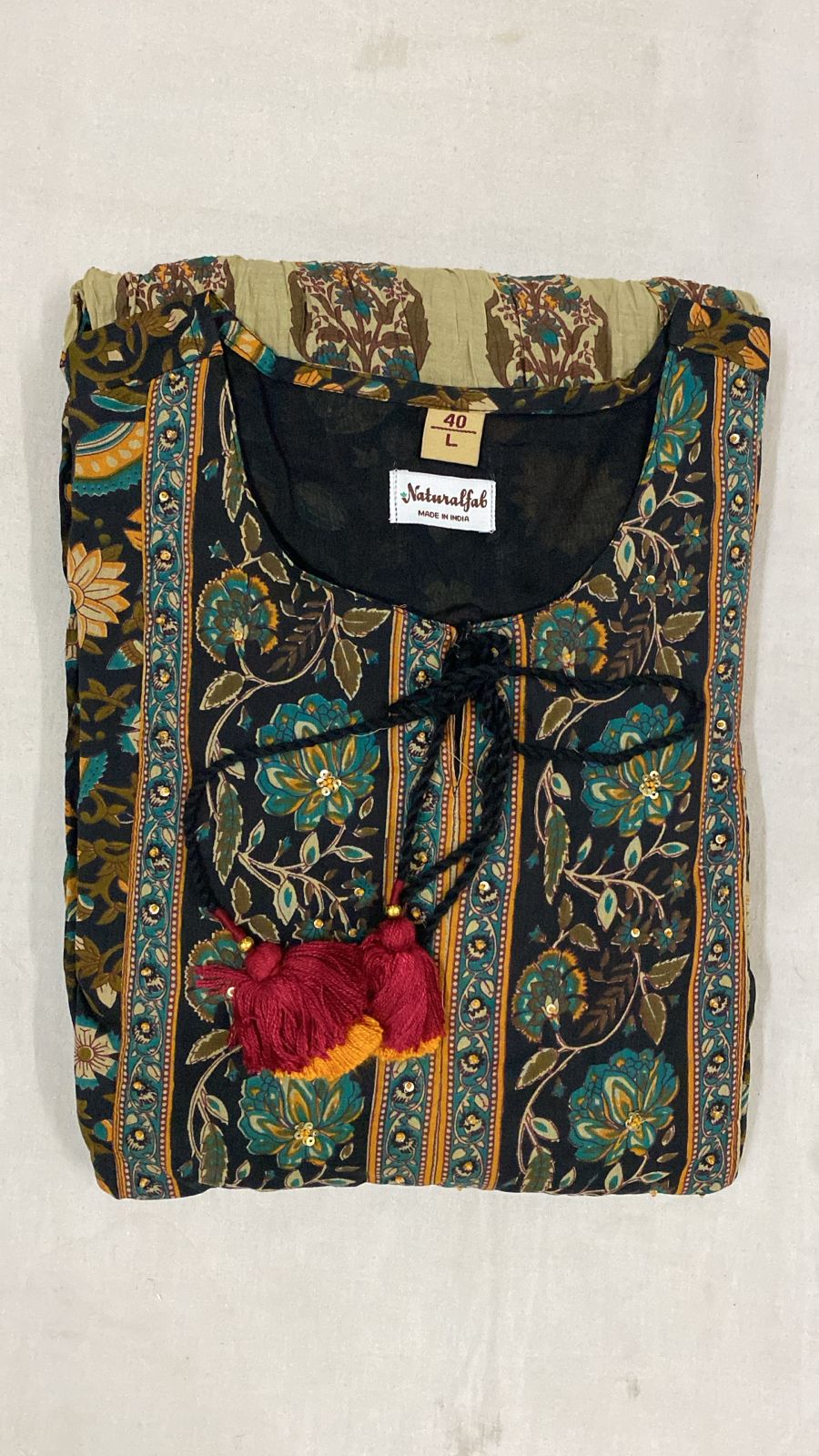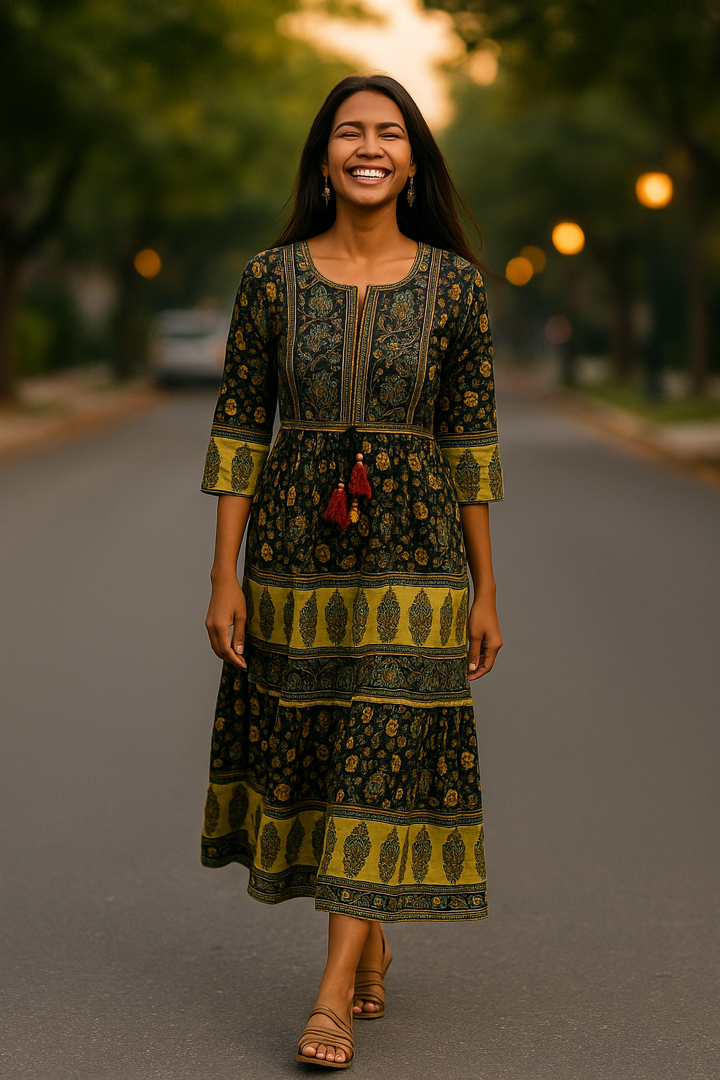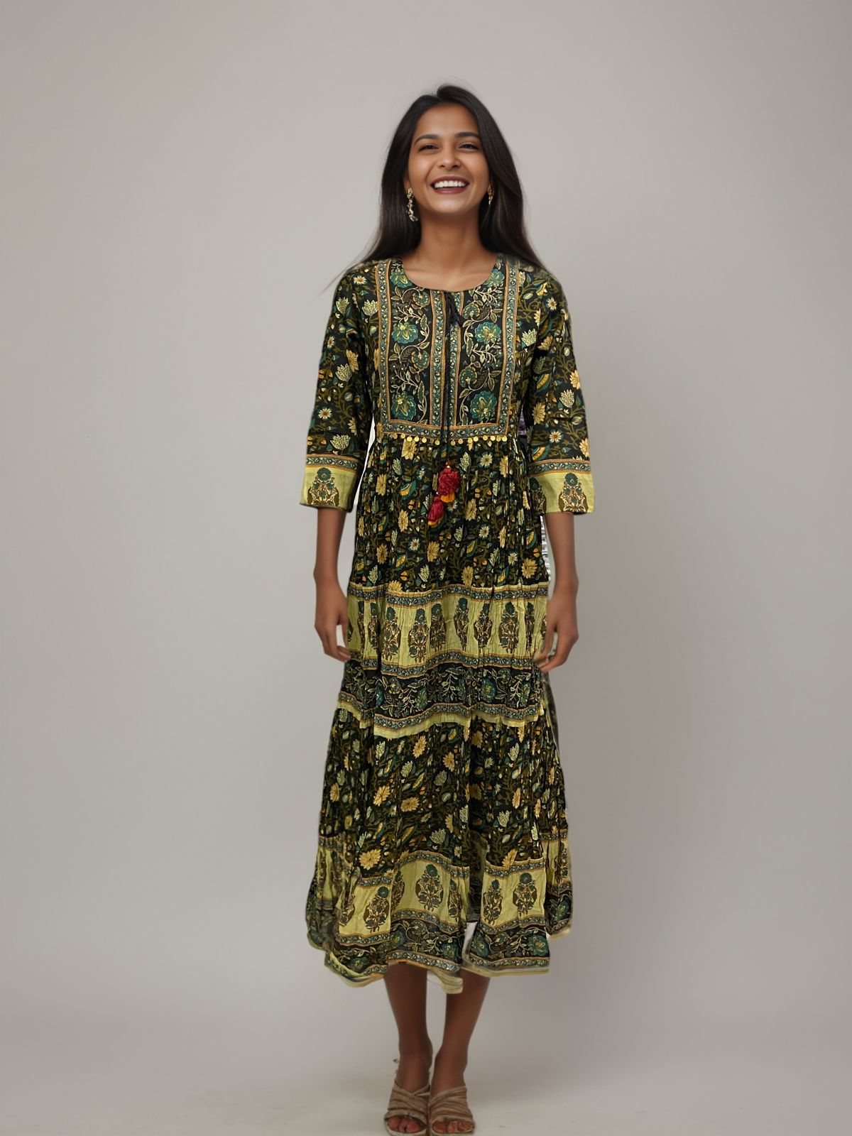 Color: Deep Olive Green with Yellow and Multicolor Traditional Prints