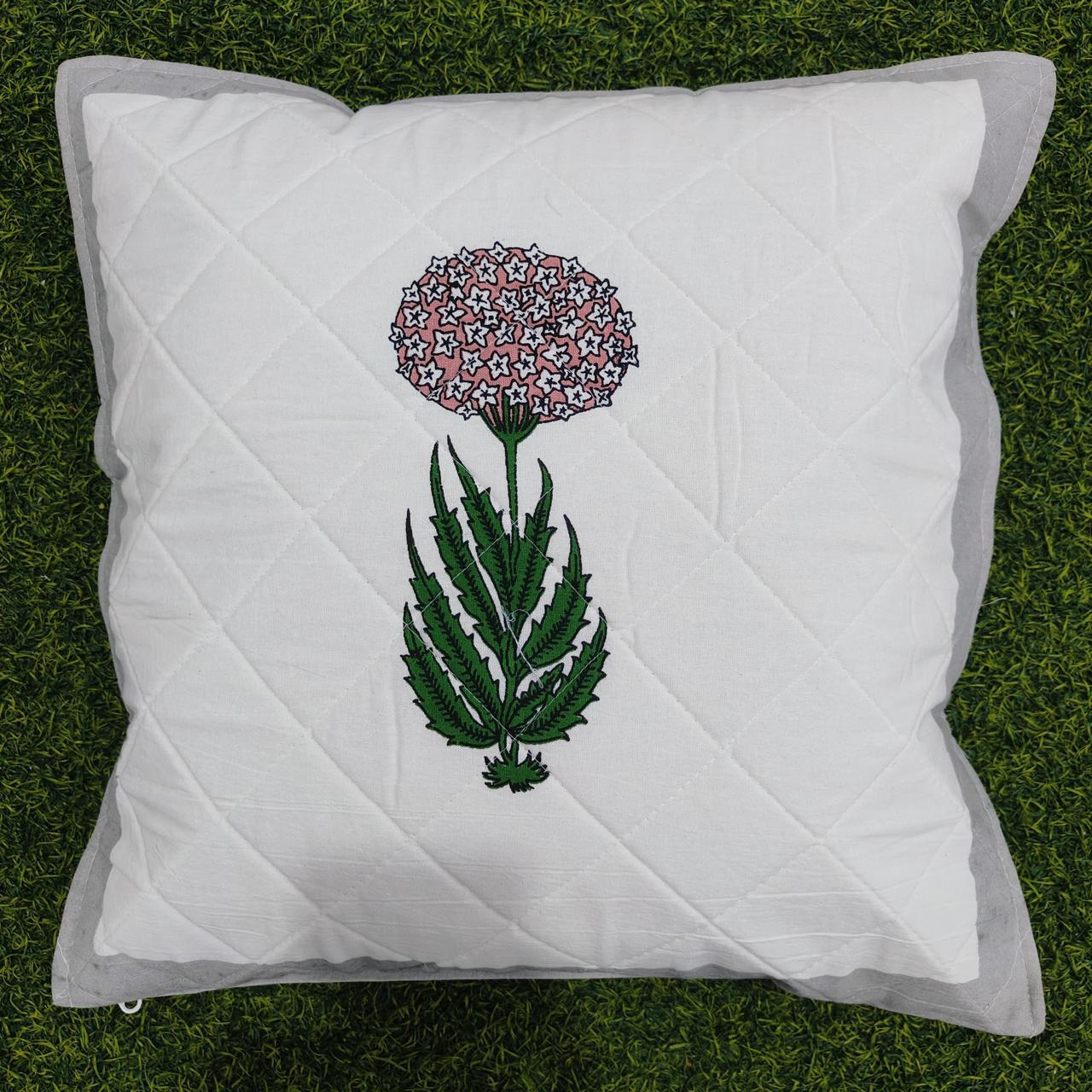 Enhance the charm of your living space with this beautiful set of floral embroidered cushion covers. Each cushion features a delicate floral design crafted with intricate embroidery on a quilted white fabric, bordered by a soft pastel green edge for a sophisticated touch. Made from high-quality materials, these covers are soft, durable, and easy to maintain, making them perfect for sofas, chairs, or beds. Add a hint of elegance and comfort to your home décor with this stunning pair.