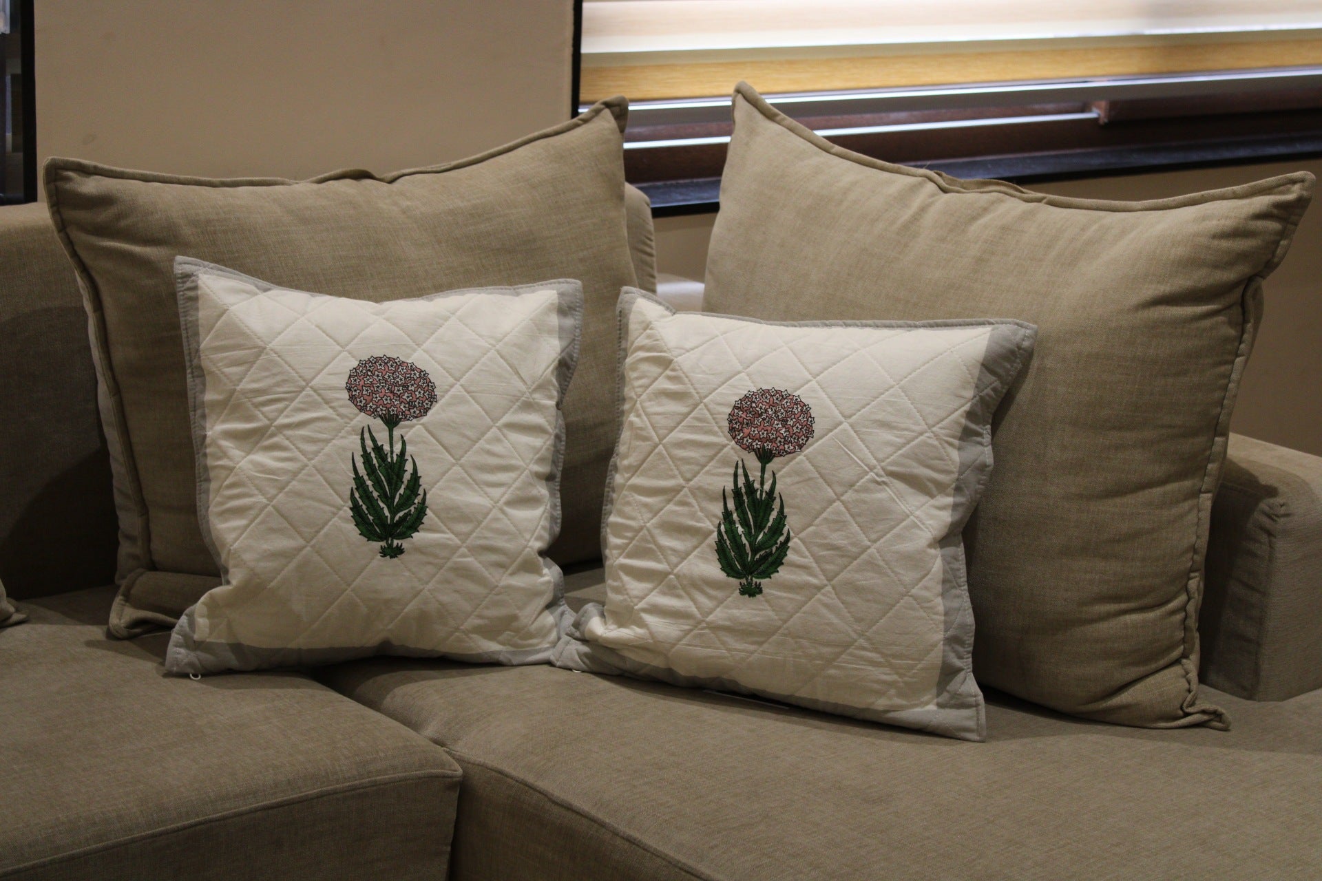 Enhance the charm of your living space with this beautiful set of floral embroidered cushion covers. Each cushion features a delicate floral design crafted with intricate embroidery on a quilted white fabric, bordered by a soft pastel green edge for a sophisticated touch. Made from high-quality materials, these covers are soft, durable, and easy to maintain, making them perfect for sofas, chairs, or beds. Add a hint of elegance and comfort to your home décor with this stunning pair.