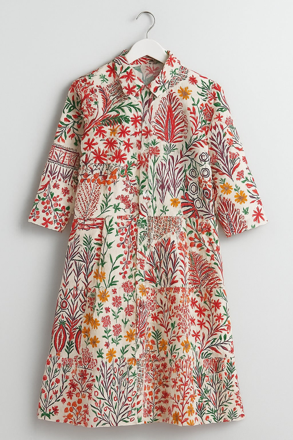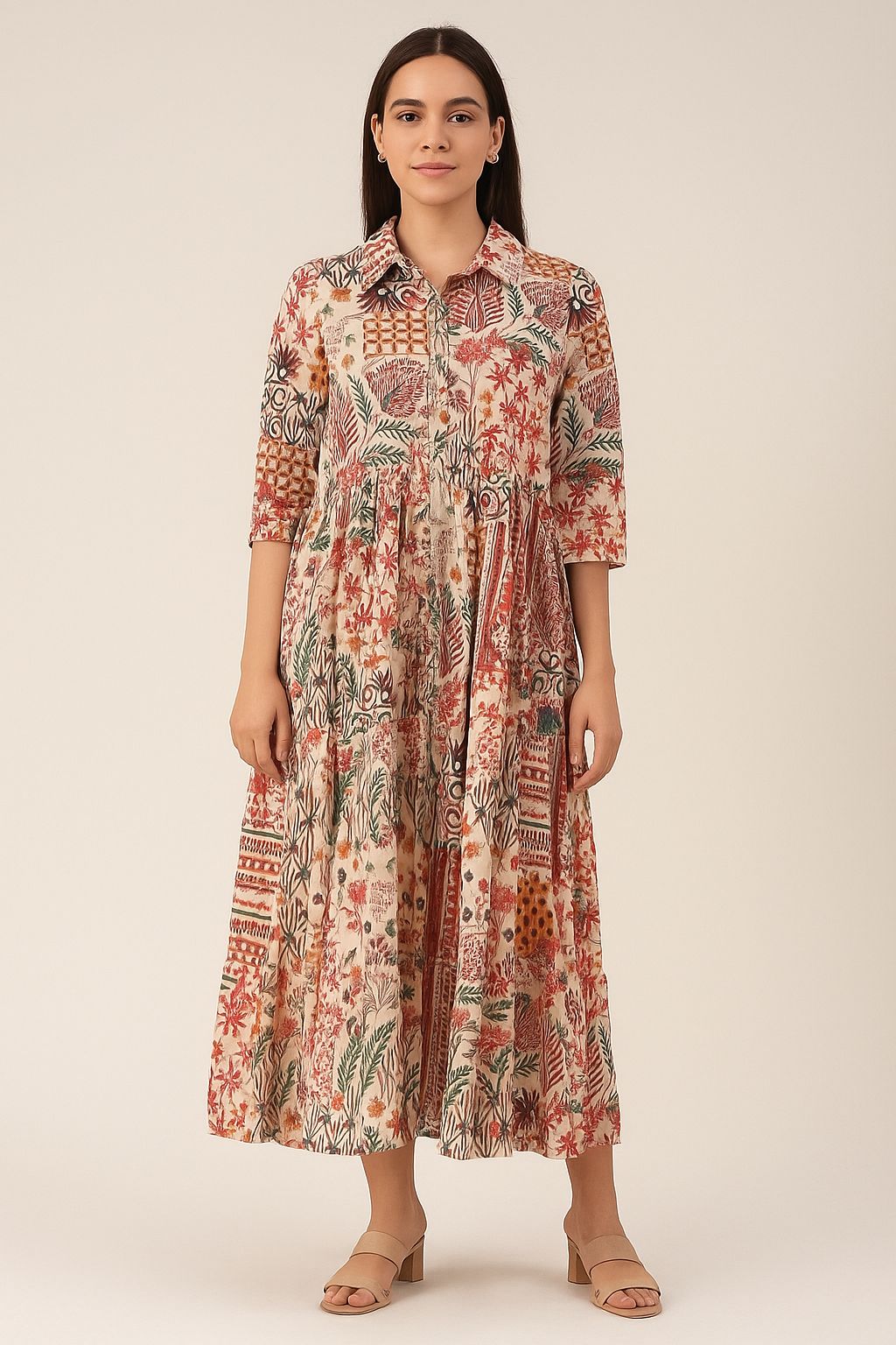 Step into effortless style with this Floral Printed Cotton Shirt Dress, designed to blend comfort and charm. Featuring a structured shirt collar, front button placket, and pleated flare, this midi dress brings a relaxed yet polished vibe. The multi-color hand block-style botanical print gives it a natural, earthy appeal perfect for brunches, day outings, or vacation wear.