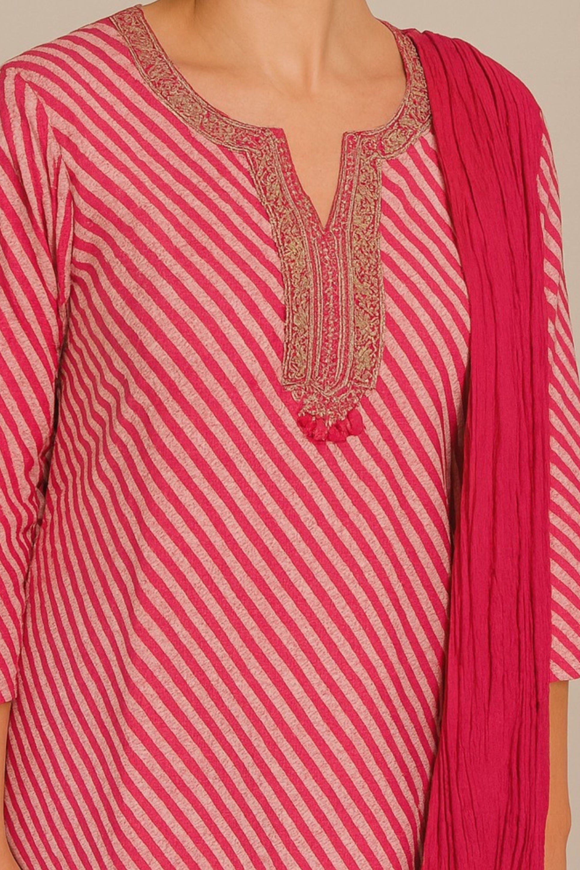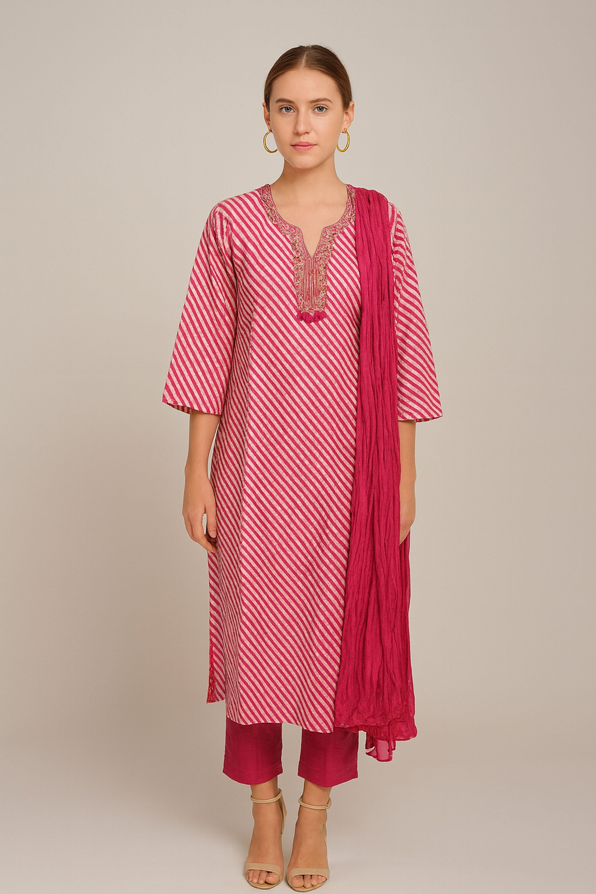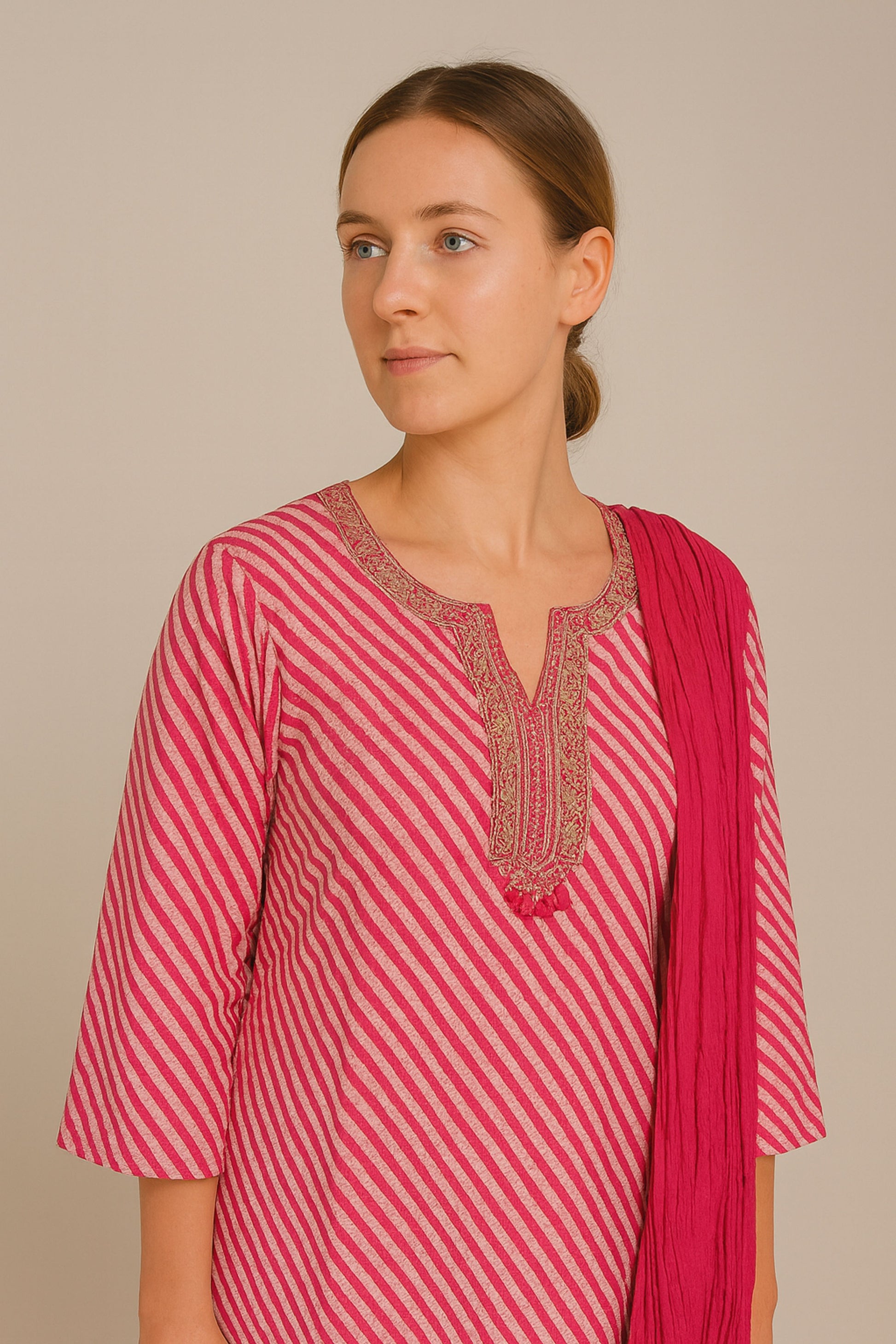 Fuchsia Drift 100% Cotton Diagonal Stripe Kurti Dupatta Set – Casual Chic Ensemble
