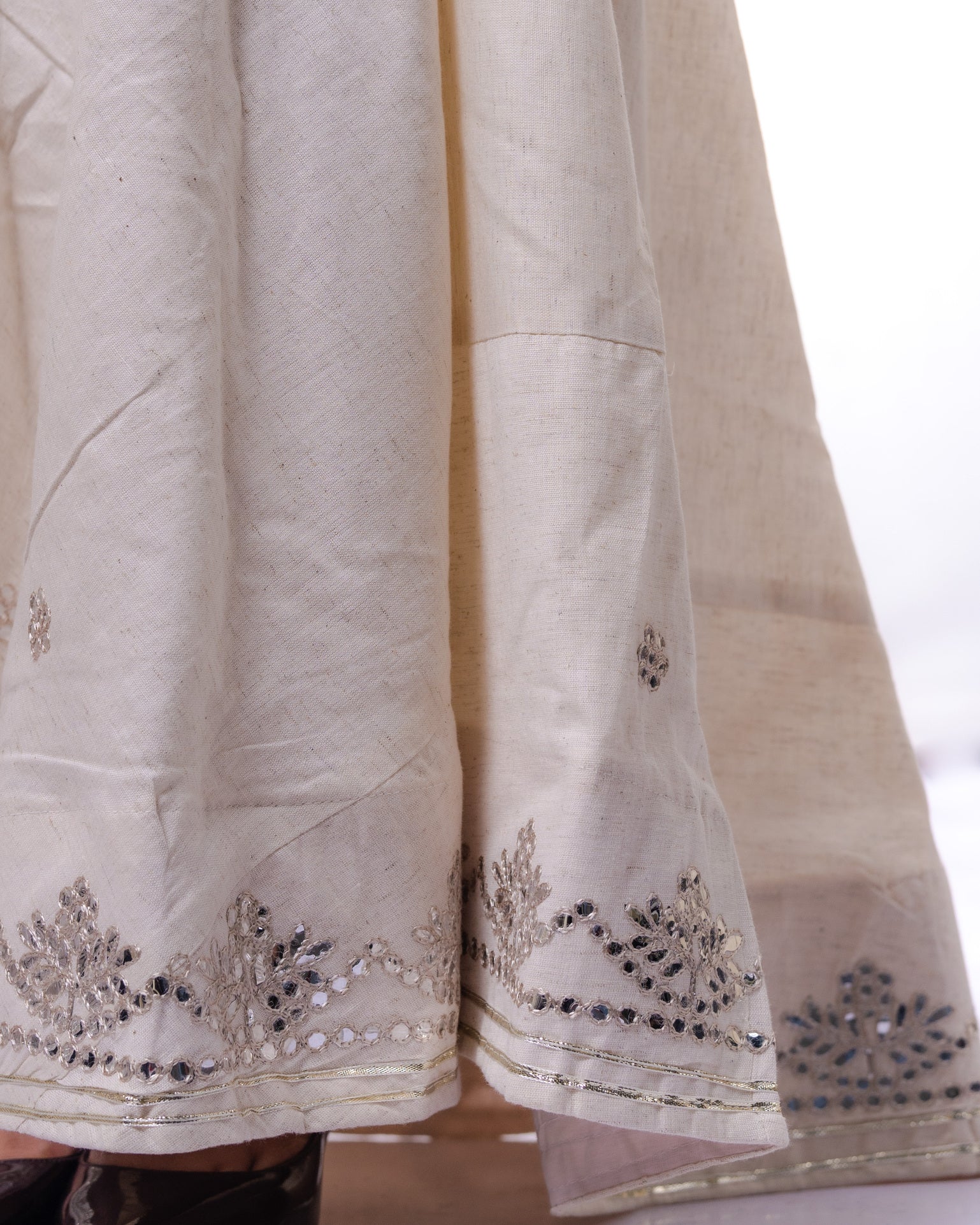This exquisite khadi skirt is a perfect blend of traditional craftsmanship and contemporary style. The skirt is made from soft and lightweight khadi fabric, which is known for its natural texture and durability. The gota patti work on the skirt is done by skilled artisans, using intricate hand embroidery techniques that have been passed down through generations. The golden gota patti embellishments are beautifully arranged in a floral pattern, adding a touch of glamour and elegance to the skirt. The skirt features a comfortable elasticated waistband and falls gracefully in a flared silhouette, making it a perfect choice for any festive occasion or special event. Whether you pair it with a simple blouse or dress it up with a statement necklace and earrings, this khadi skirt with gota patti work is sure to make you stand out in a crowd.