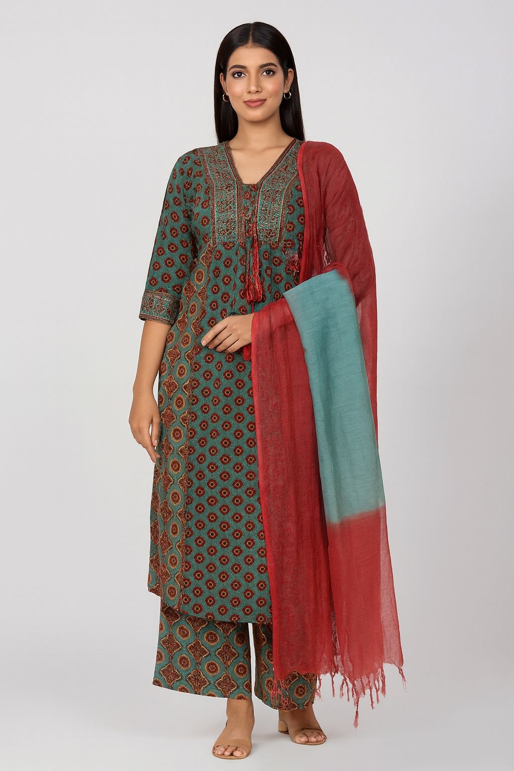 Bring comfort and elegance together with this green cotton kurti set, featuring traditional block-inspired prints and intricate embroidery on the neckline. The set includes a straight-cut kurta, matching palazzo pants, and a dual-tone dupatta that adds a stylish contrast. Crafted in breathable cotton fabric, this outfit is ideal for festive gatherings, office wear, or casual day outings. Lightweight and versatile, it ensures both style and comfort in every season.