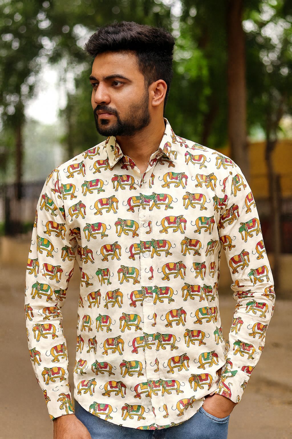 Handblock Printed Elephant Motif Cotton Shirt for Men – Beige