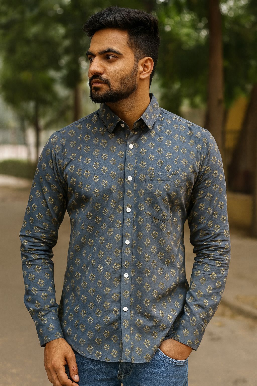 Handblock Printed Indigo Blue Cotton Shirt for Men – Floral Motif Design