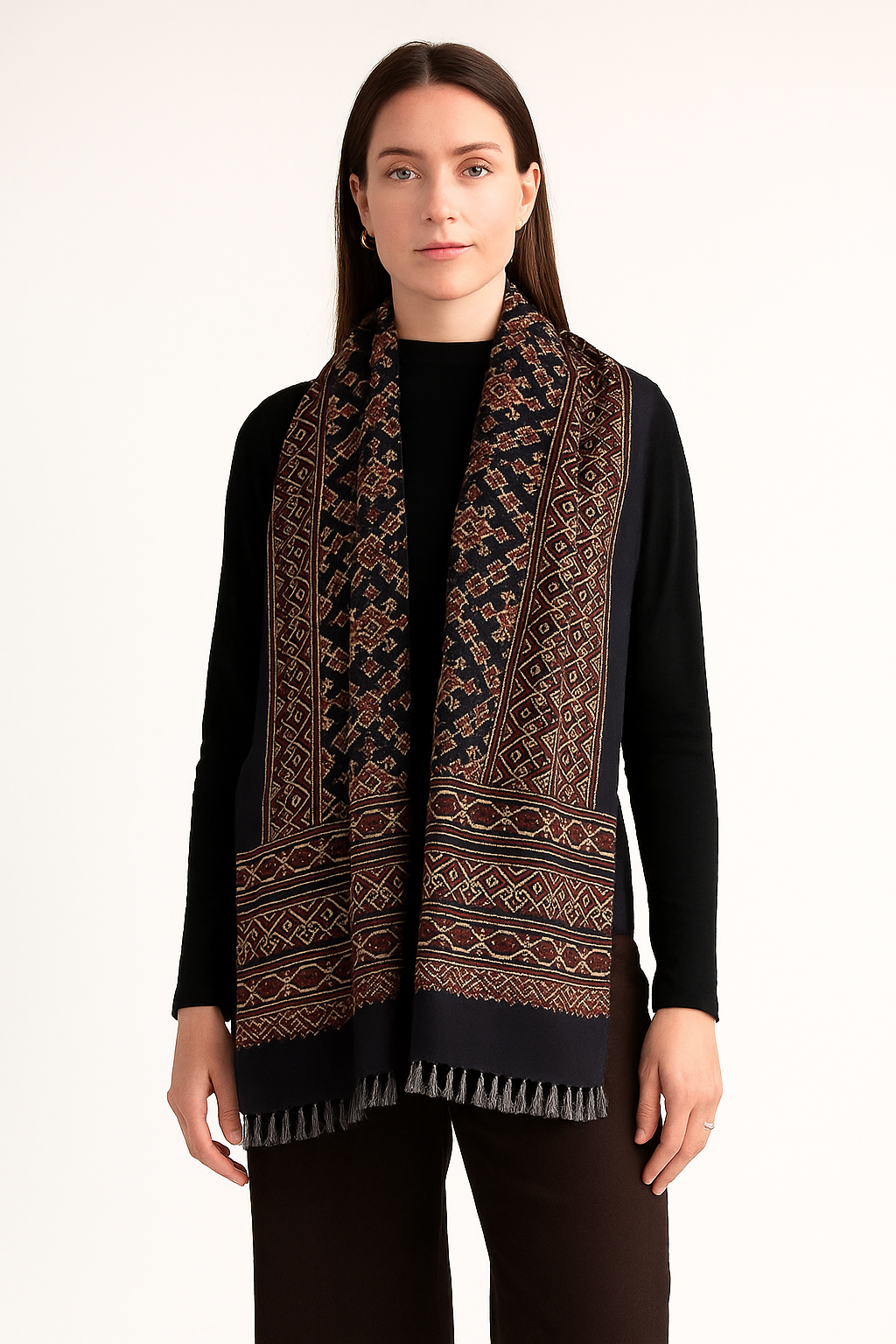 Handcrafted Ajrakh Silk Stole in Black & Maroon | Traditional Geometric Tassels