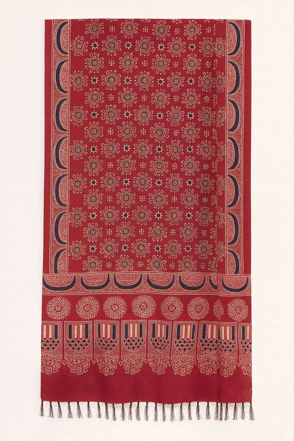 Handcrafted Red Ajrakh Silk Stole | Traditional Floral & Geometric Motifs and Tassels
