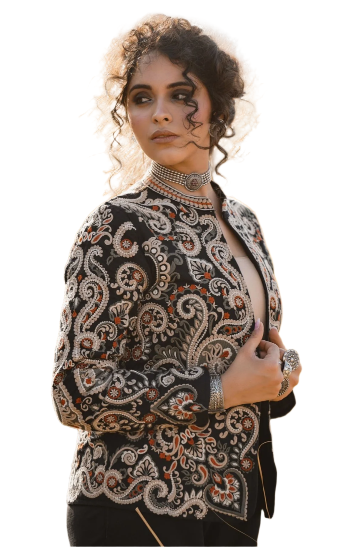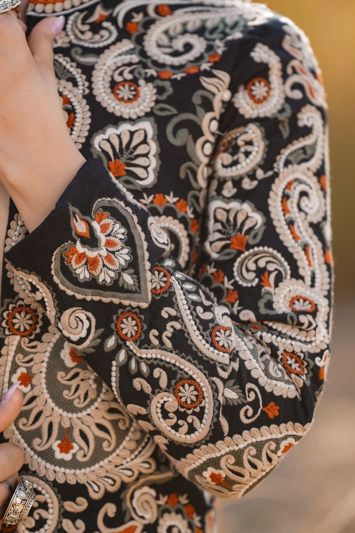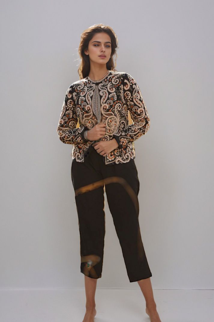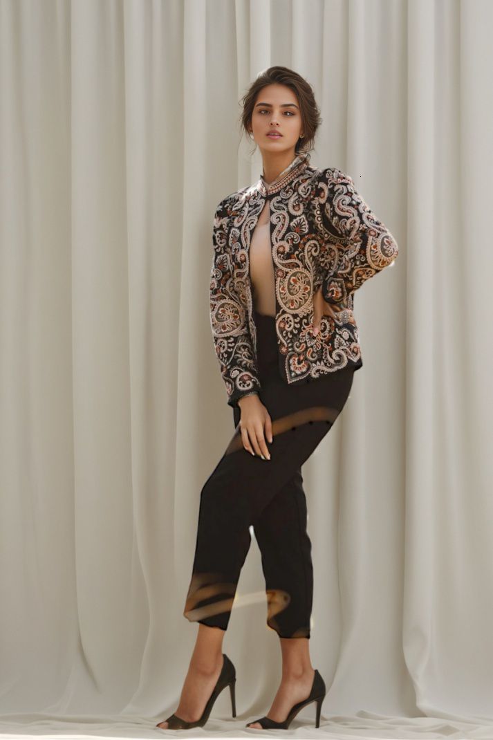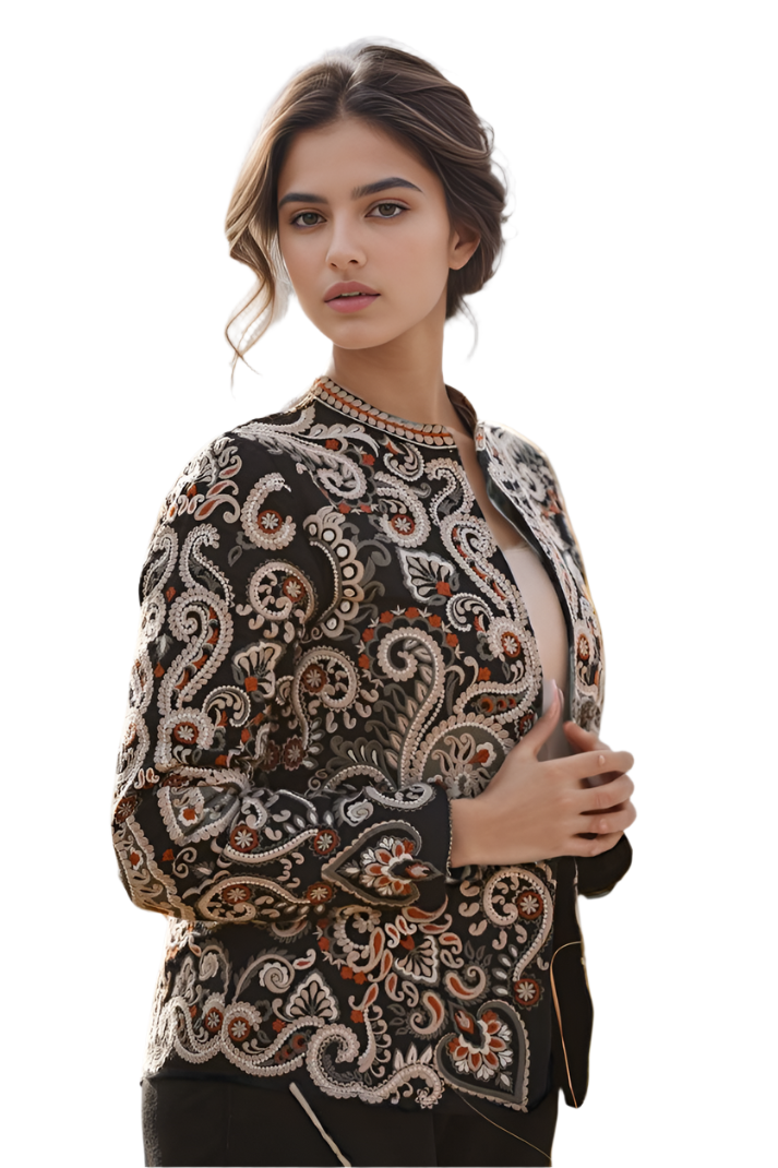 This stunning Parsi Gara embroidered jacket brings together tradition and elegance. Featuring meticulously detailed floral and paisley patterns, the intricate hand-embroidery on luxurious black fabric highlights the rich heritage of Parsi craftsmanship. The design showcases a beautiful combination of delicate white, orange, and earthy tones that add a touch of regal sophistication. The jacket's tailored fit and sleek silhouette make it versatile for both formal occasions and upscale casual wear. Pair it with statement jewelry to enhance its artistic appeal. This Parsi Gara jacket is the perfect piece to elevate your wardrobe with timeless grace and cultural artistry