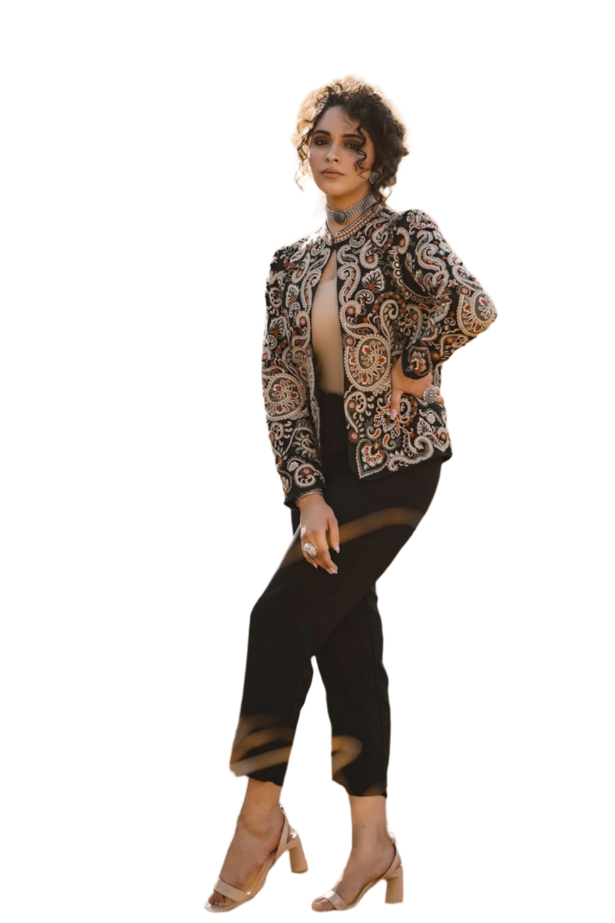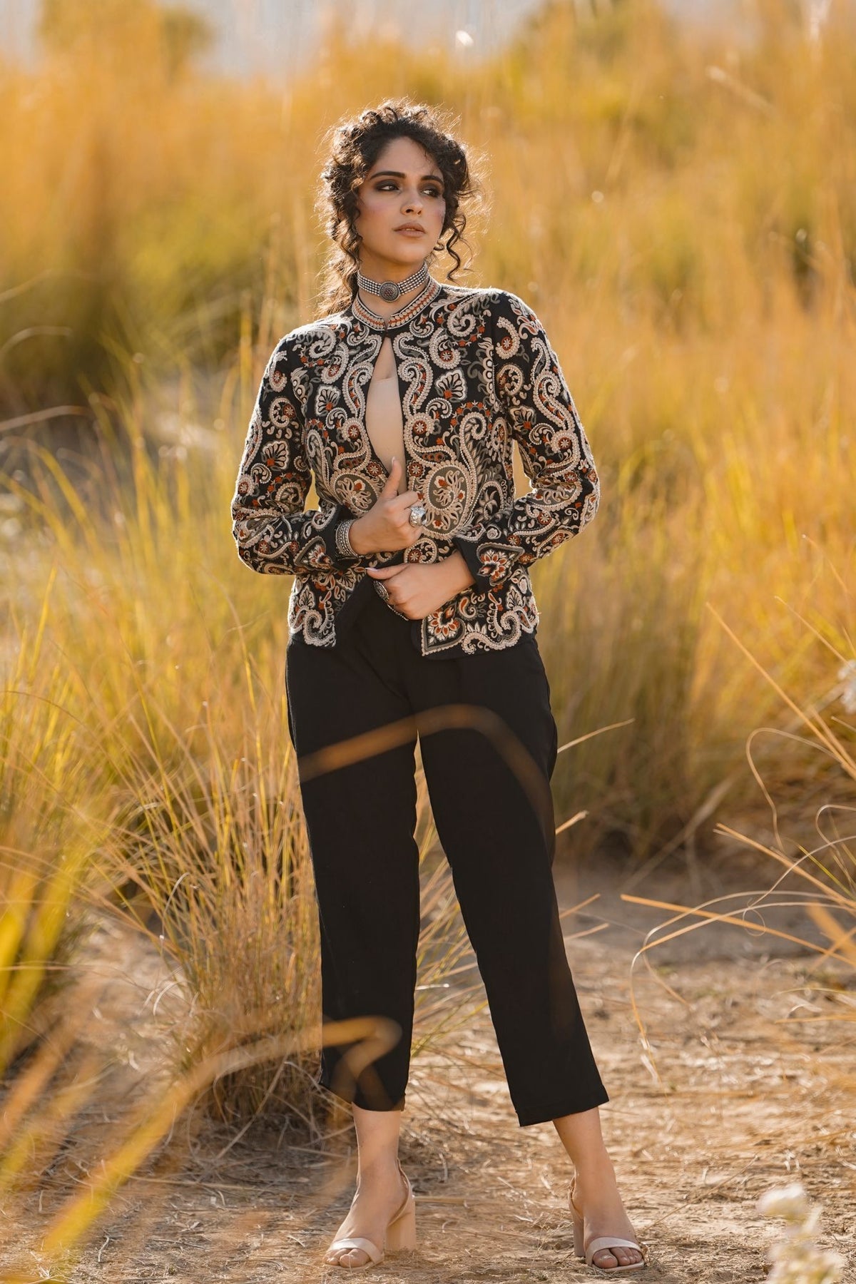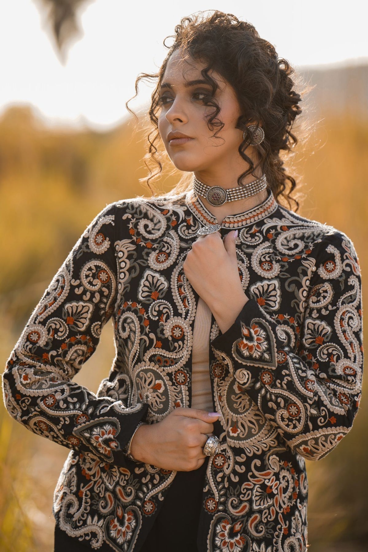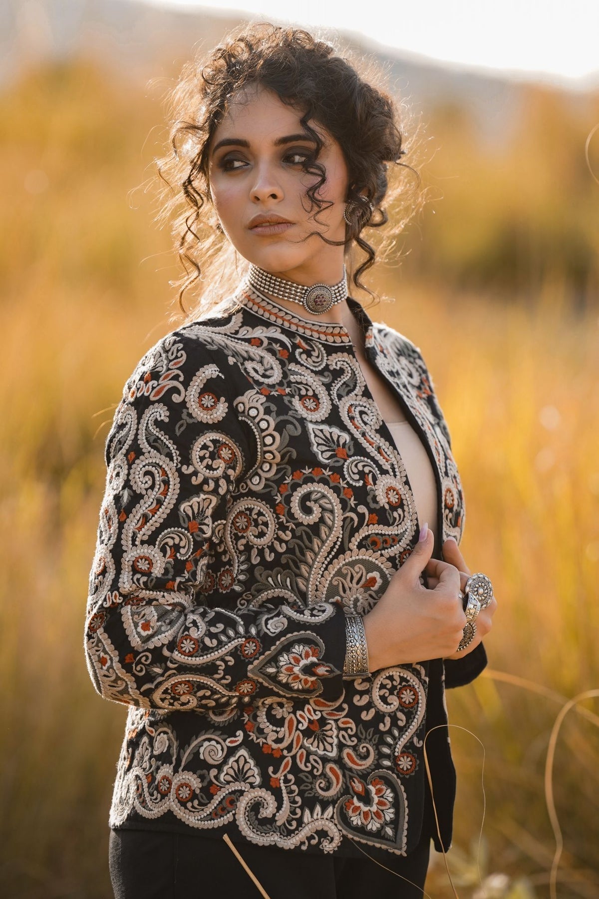 This stunning Parsi Gara embroidered jacket brings together tradition and elegance. Featuring meticulously detailed floral and paisley patterns, the intricate hand-embroidery on luxurious black fabric highlights the rich heritage of Parsi craftsmanship. The design showcases a beautiful combination of delicate white, orange, and earthy tones that add a touch of regal sophistication. The jacket's tailored fit and sleek silhouette make it versatile for both formal occasions and upscale casual wear. Pair it with statement jewelry to enhance its artistic appeal. This Parsi Gara jacket is the perfect piece to elevate your wardrobe with timeless grace and cultural artistry