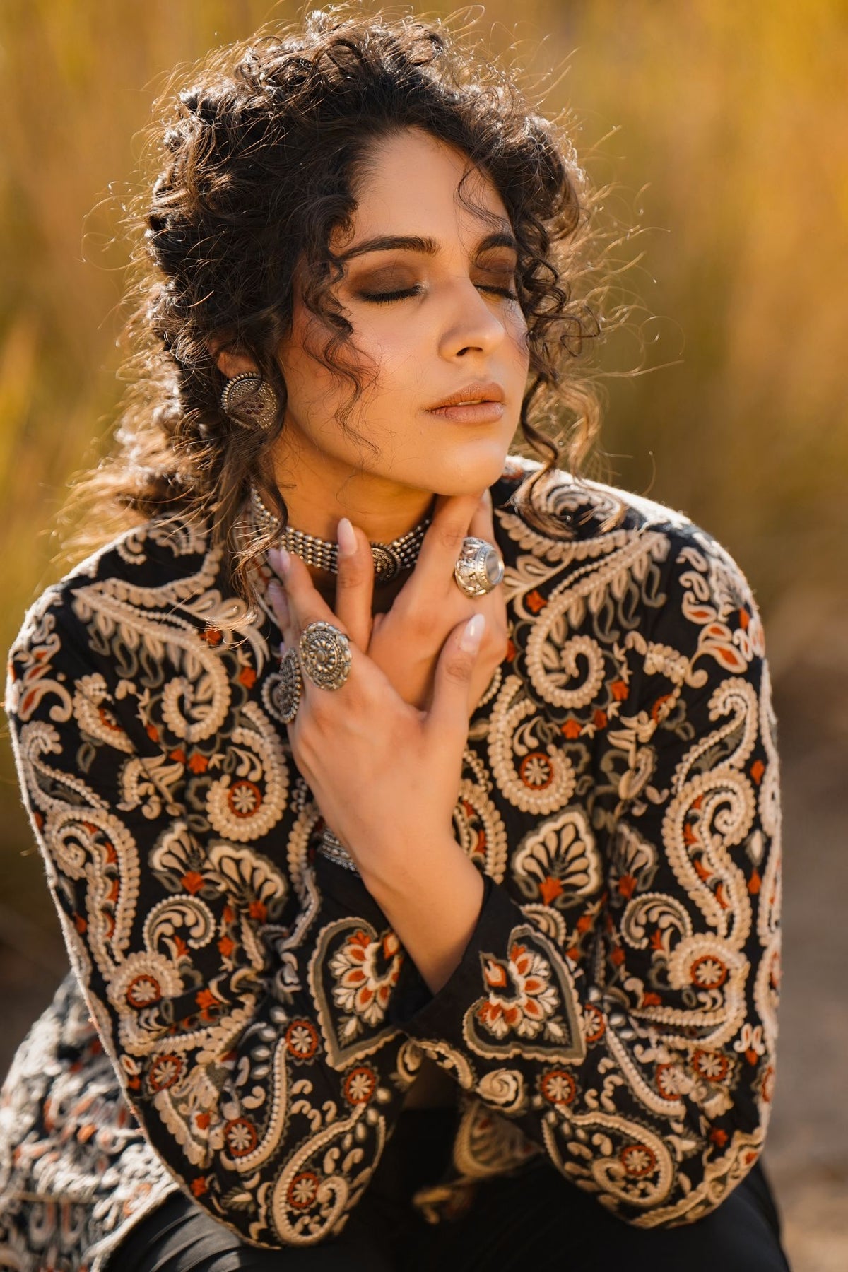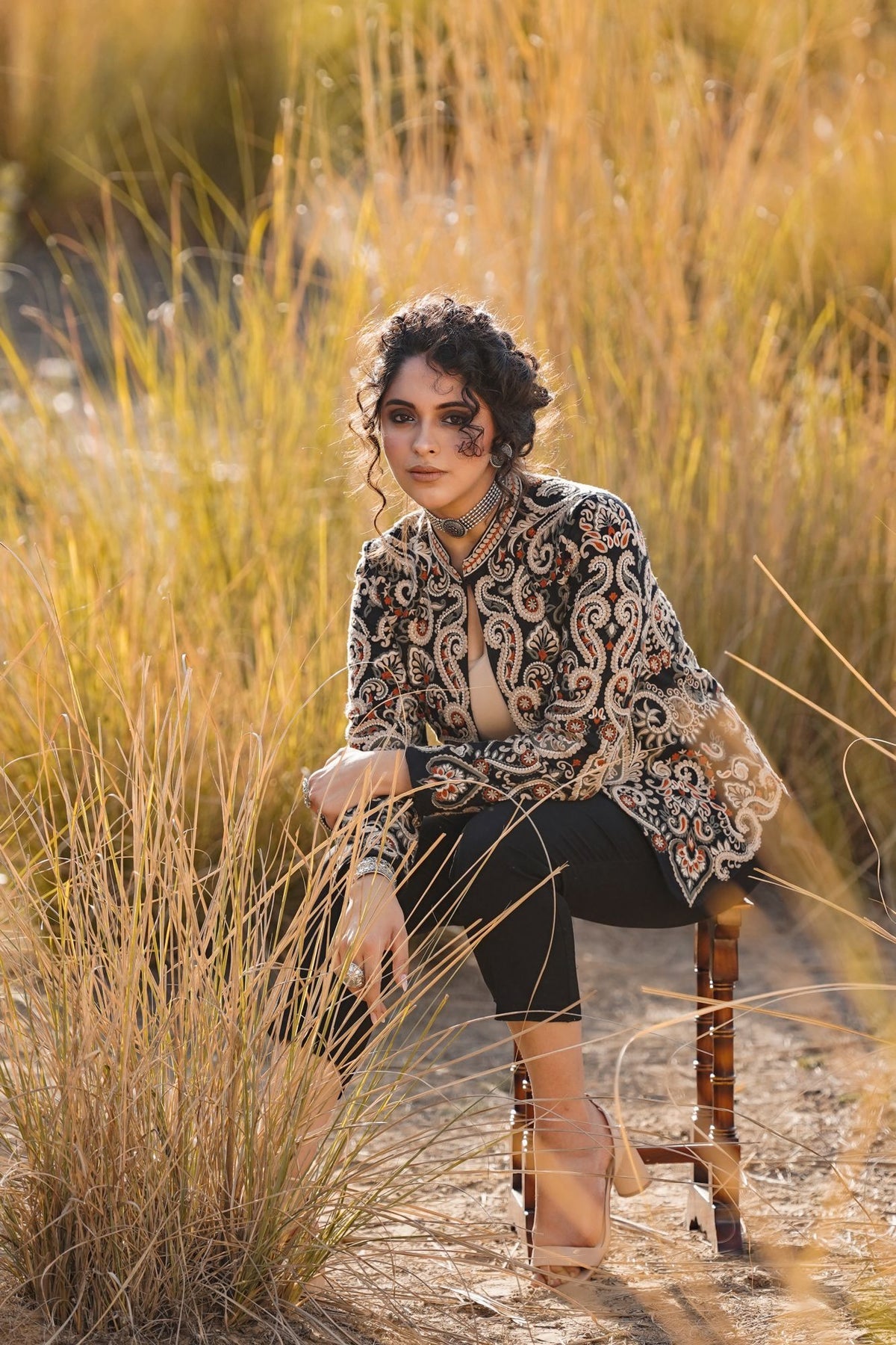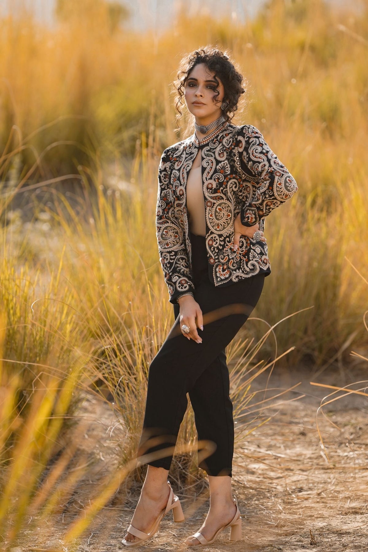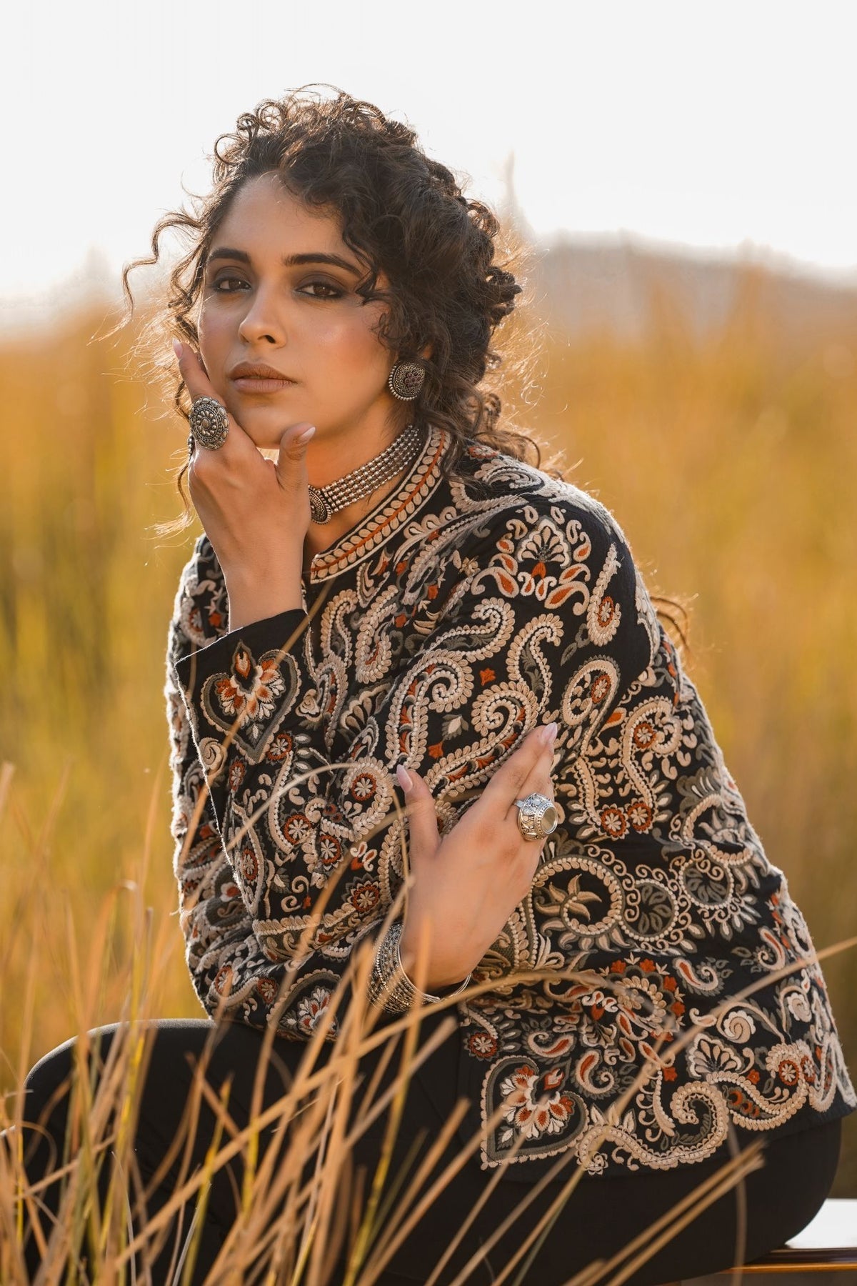 This stunning Parsi Gara embroidered jacket brings together tradition and elegance. Featuring meticulously detailed floral and paisley patterns, the intricate hand-embroidery on luxurious black fabric highlights the rich heritage of Parsi craftsmanship. The design showcases a beautiful combination of delicate white, orange, and earthy tones that add a touch of regal sophistication. The jacket's tailored fit and sleek silhouette make it versatile for both formal occasions and upscale casual wear. Pair it with statement jewelry to enhance its artistic appeal. This Parsi Gara jacket is the perfect piece to elevate your wardrobe with timeless grace and cultural artistry