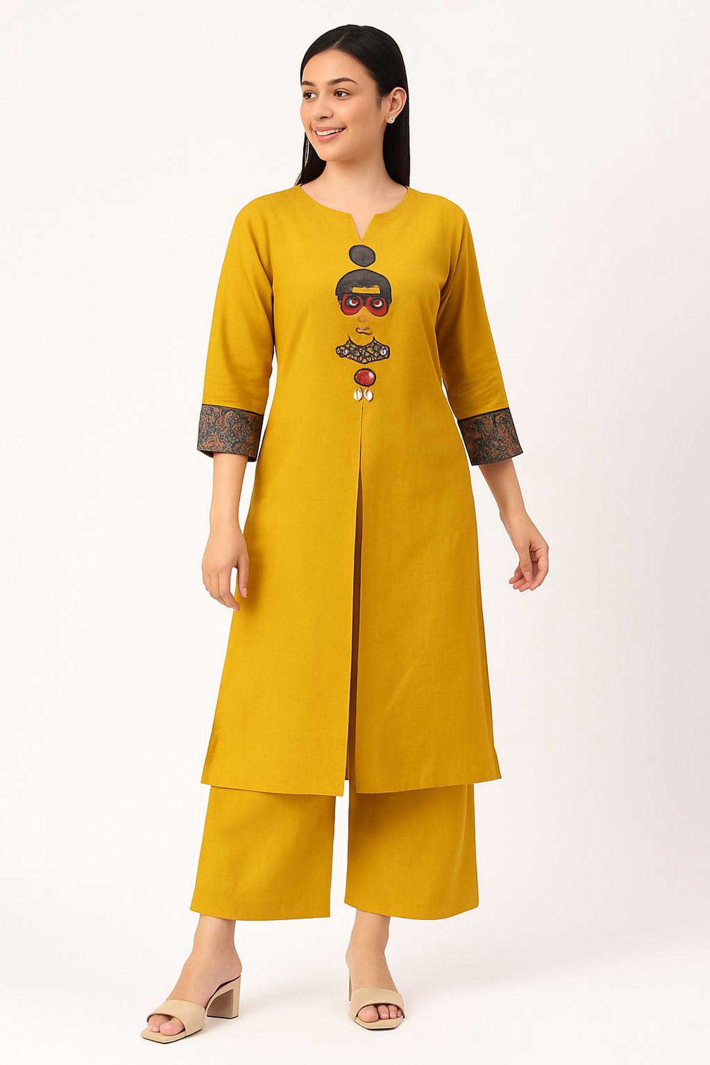 Add a pop of sunshine to your wardrobe with this elegant mustard yellow cotton kurta set for women by Natural Fab. Made from breathable cotton fabric, this set features a stylish straight-cut kurta with unique handcrafted embroidery and playful embellishments. The kurta has 3/4th sleeves with printed cuffs and a flattering notch neckline. It comes paired with wide-leg palazzo pants for all-day comfort and ease.