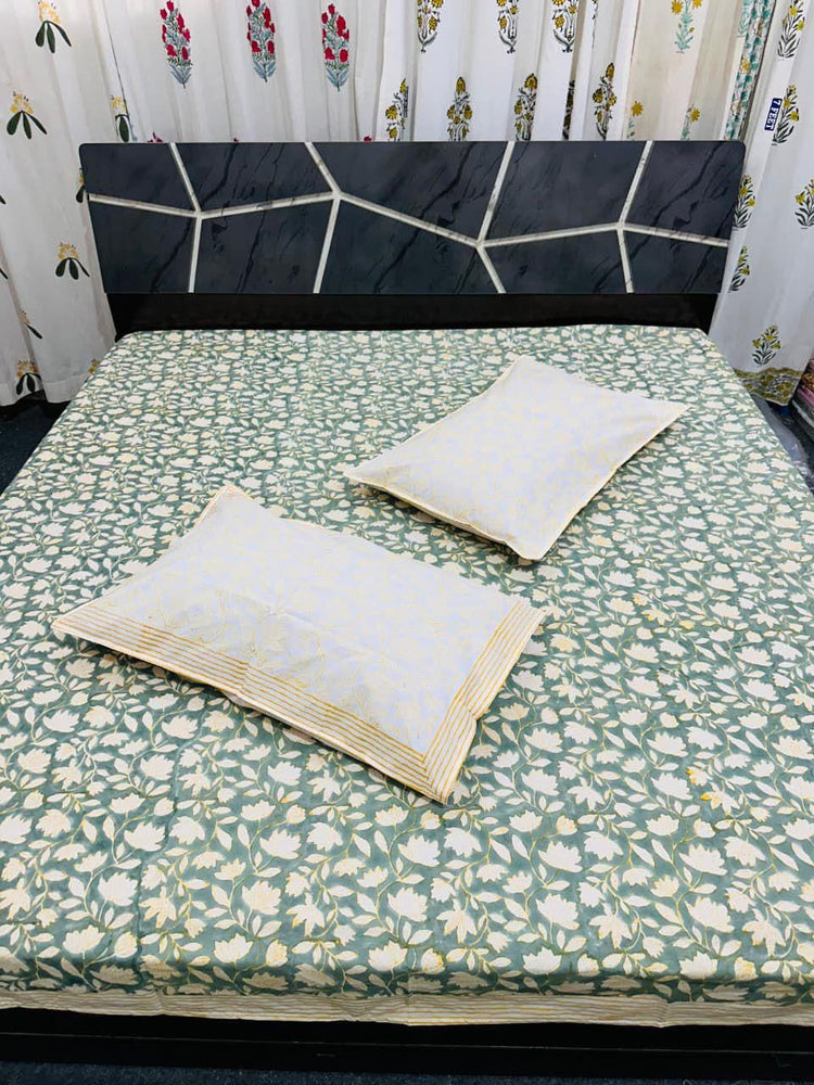 Natural Fab Green Floral Handblock Printed Cotton Double Bedsheet with 2 Pillow Covers – Soft, Premium & Breathable Fabric