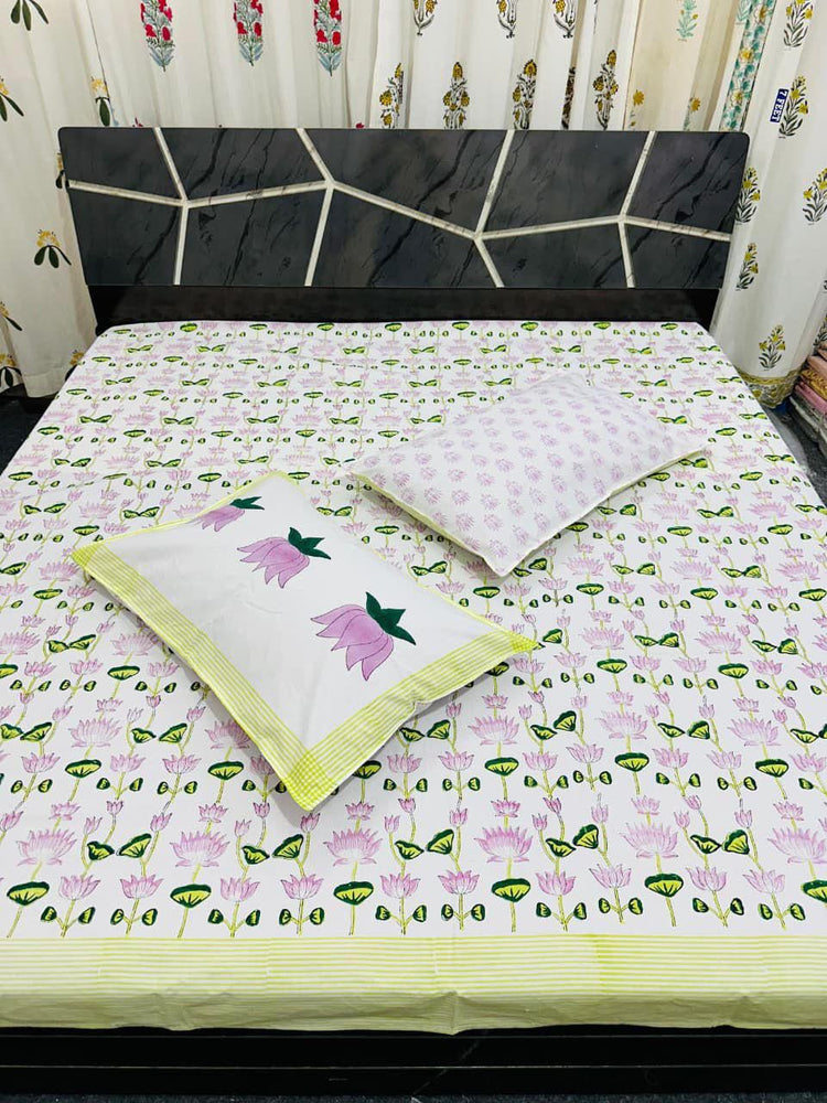 Natural Fab Pink Lotus Handblock Printed Cotton Double Bedsheet with 2 Pillow Covers – Soft & Elegant Floral Print Bedding Set