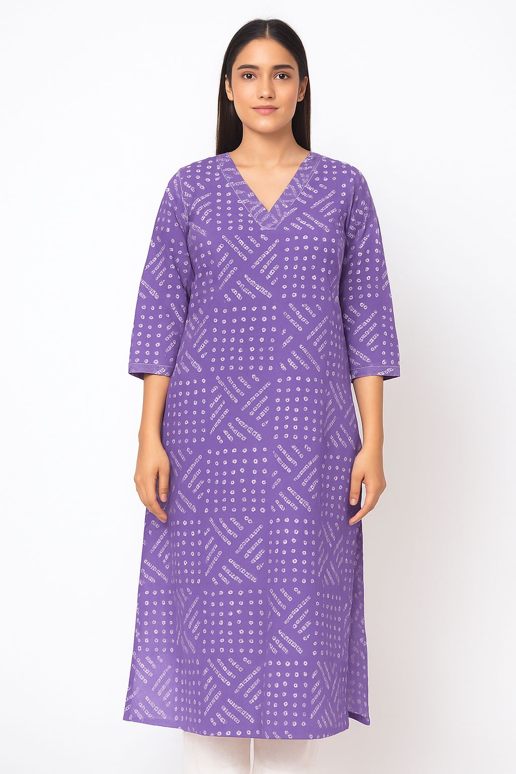 Natural Fab Purple Bandhani Print Cotton Kurti for Women | V-Neck Ethnic Wear