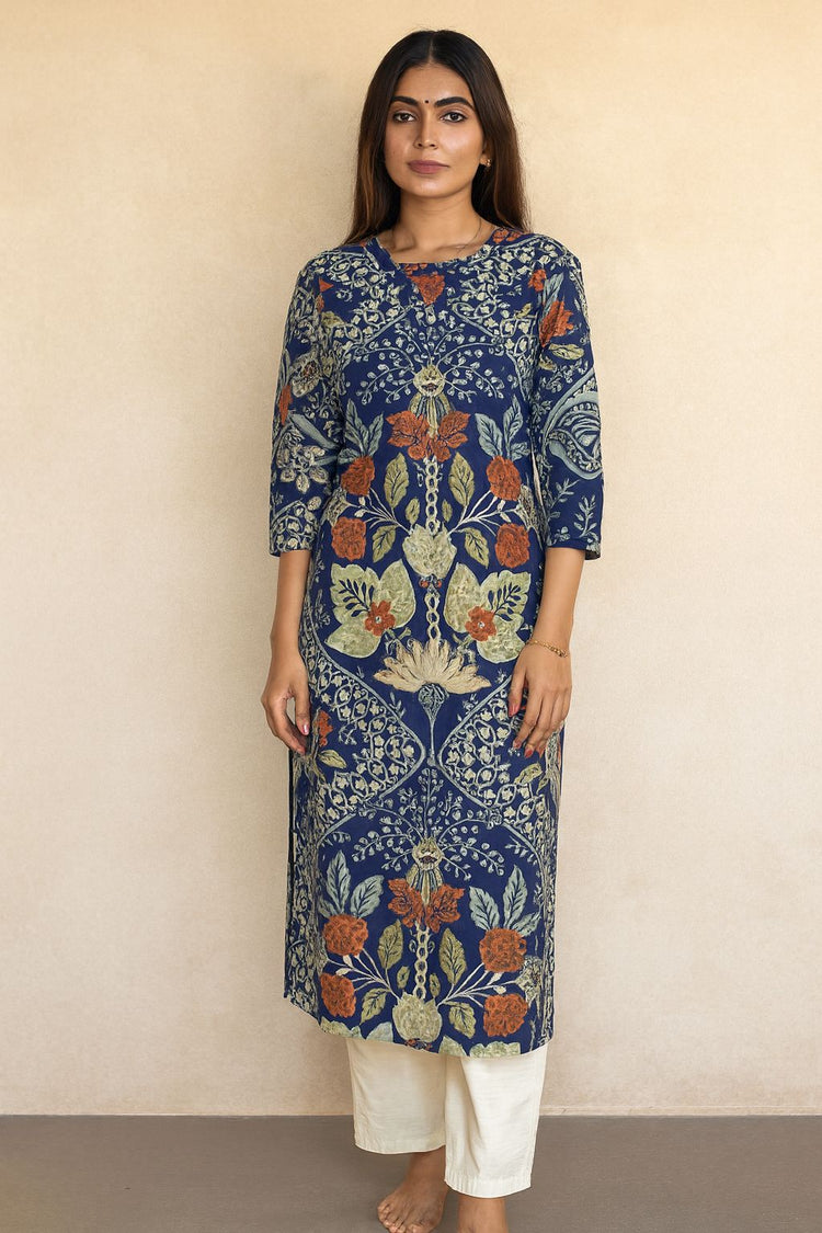 Navy Blue Cotton Floral Printed Kurti for Women – Elegant Ethnic Daily & Office Wear