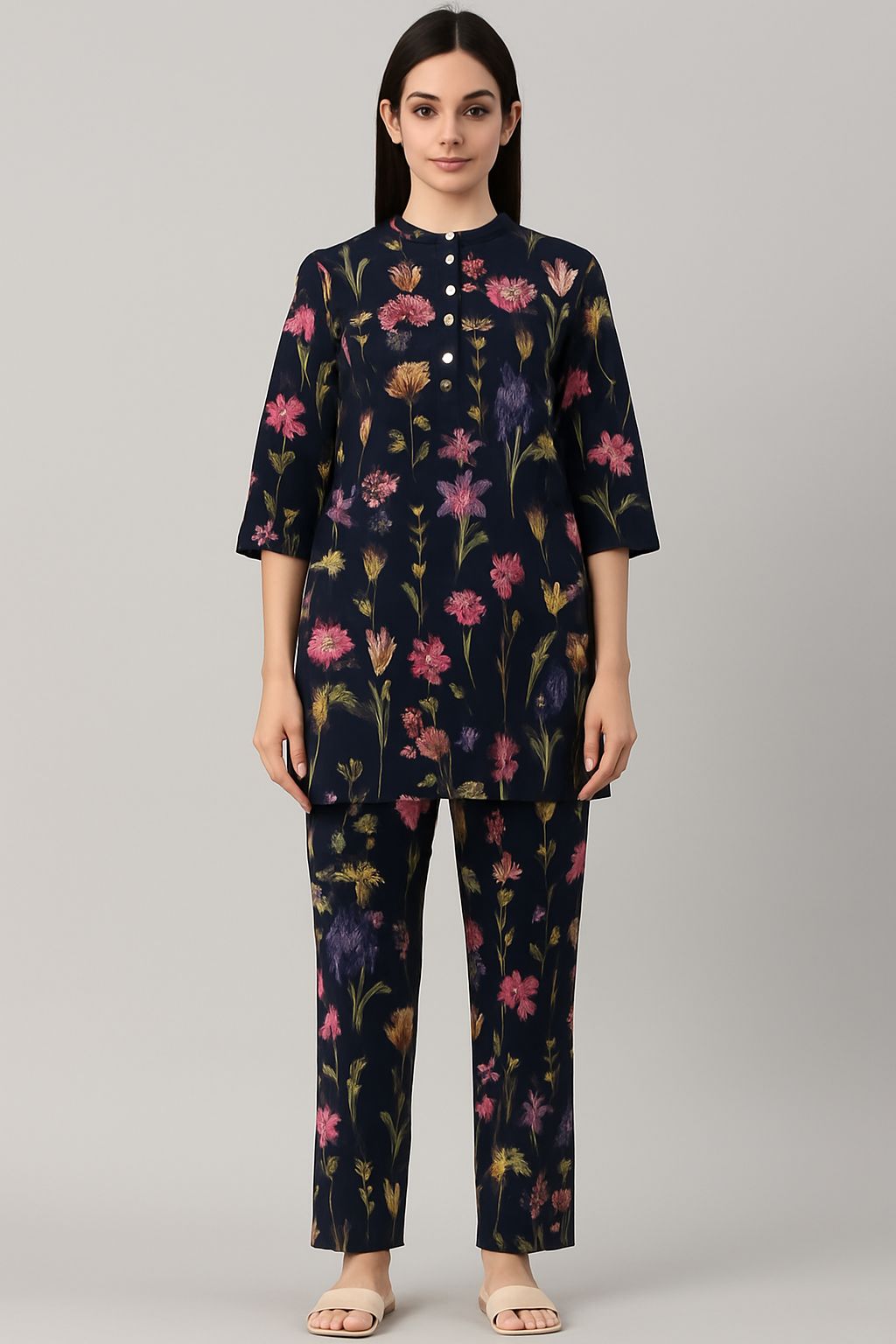 Navy Blue Floral Printed Co-ord Set for Women – Stylish Summer Coord with Mandarin Collar & Straight Pants