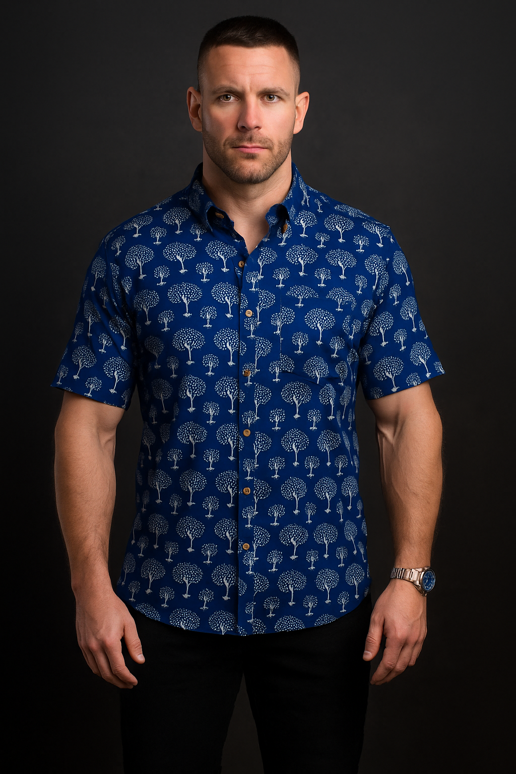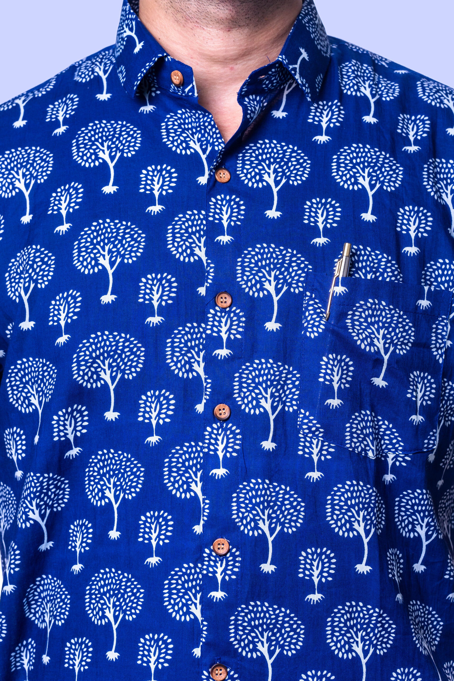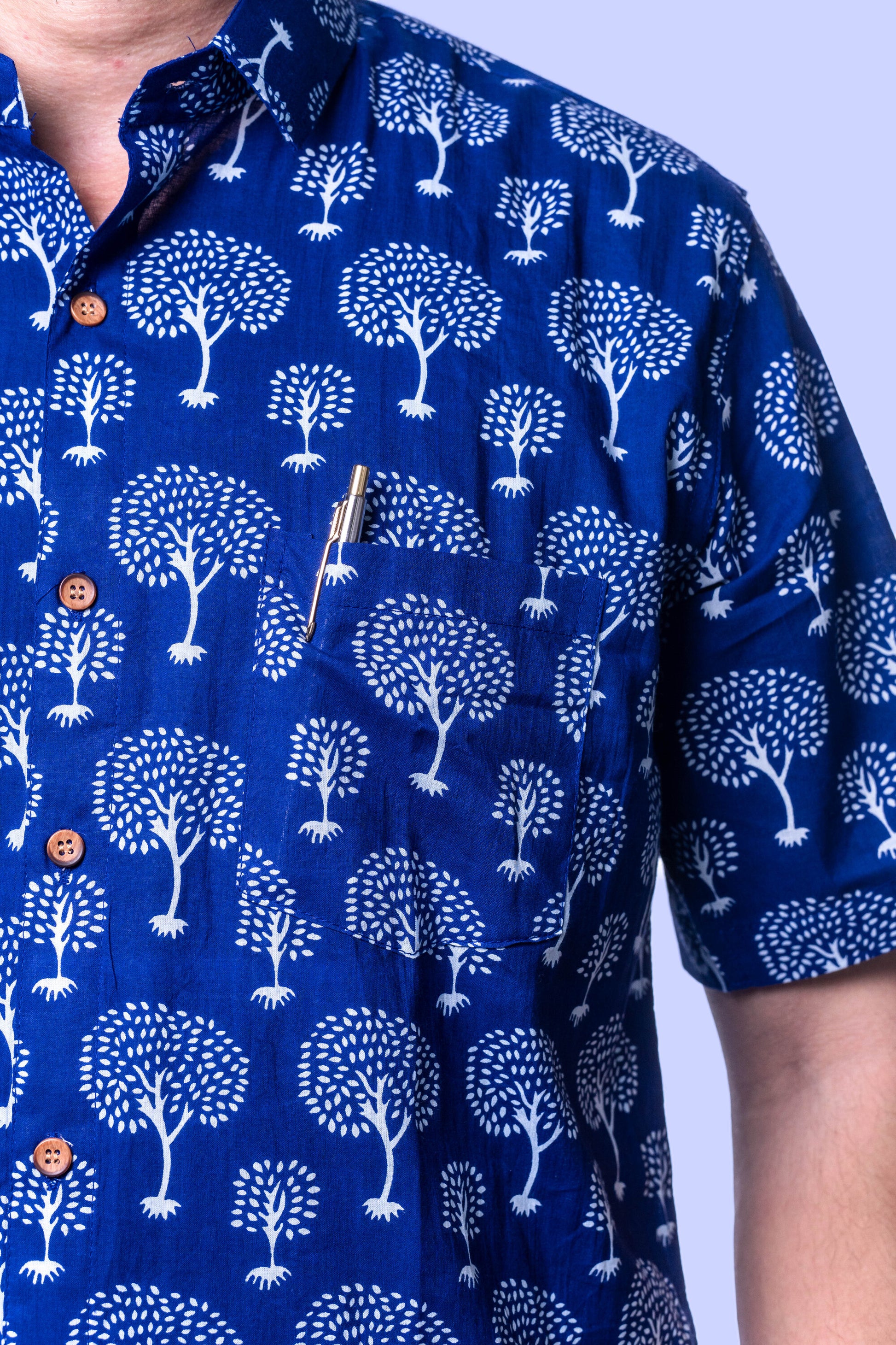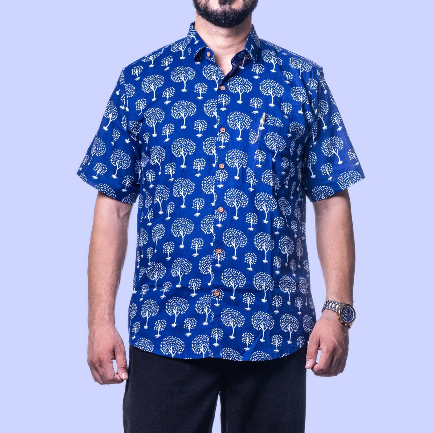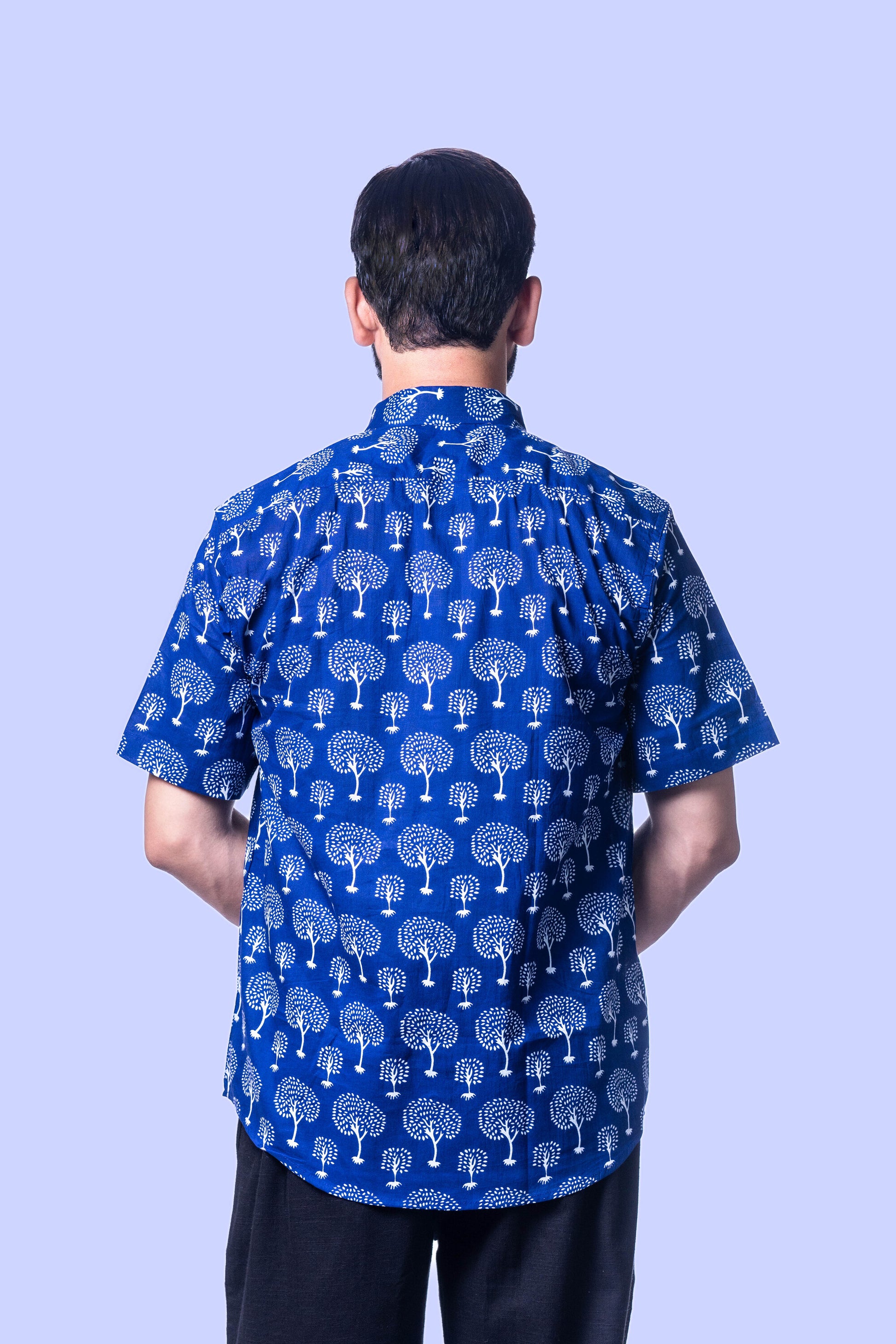 Upgrade your casual collection with our Navy Blue Hand-Block Printed Men's Shirt, a perfect blend of tradition and style. Crafted from high-quality, breathable cotton, this shirt features a unique tree pattern in white that stands out against the deep navy background. The hand-block printing technique ensures each piece is unique, reflecting artisanal craftsmanship. The shirt's relaxed fit and soft fabric make it ideal for day-long comfort, whether you're out for a casual outing or enjoying a relaxed weekend at home. Pair it with your favorite jeans or chinos for a laid-back yet stylish look.