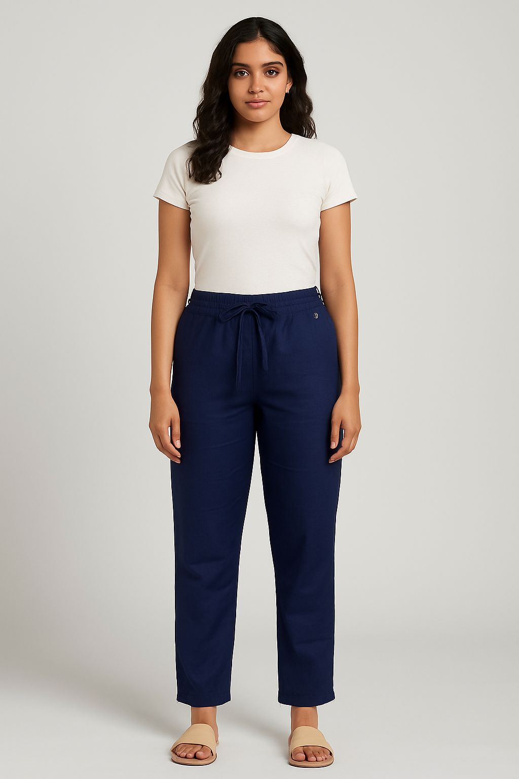 Step into effortless style with these navy blue pure cotton pants designed for everyday comfort. Featuring a relaxed straight fit, an adjustable drawstring waist, and side pockets, these pants are perfect for work-from-home days, casual outings, or travel. The breathable fabric keeps you cool and comfortable all day long while the minimal design adds a touch of sophistication. Pair it with a tee or kurti for a clean, stylish look.