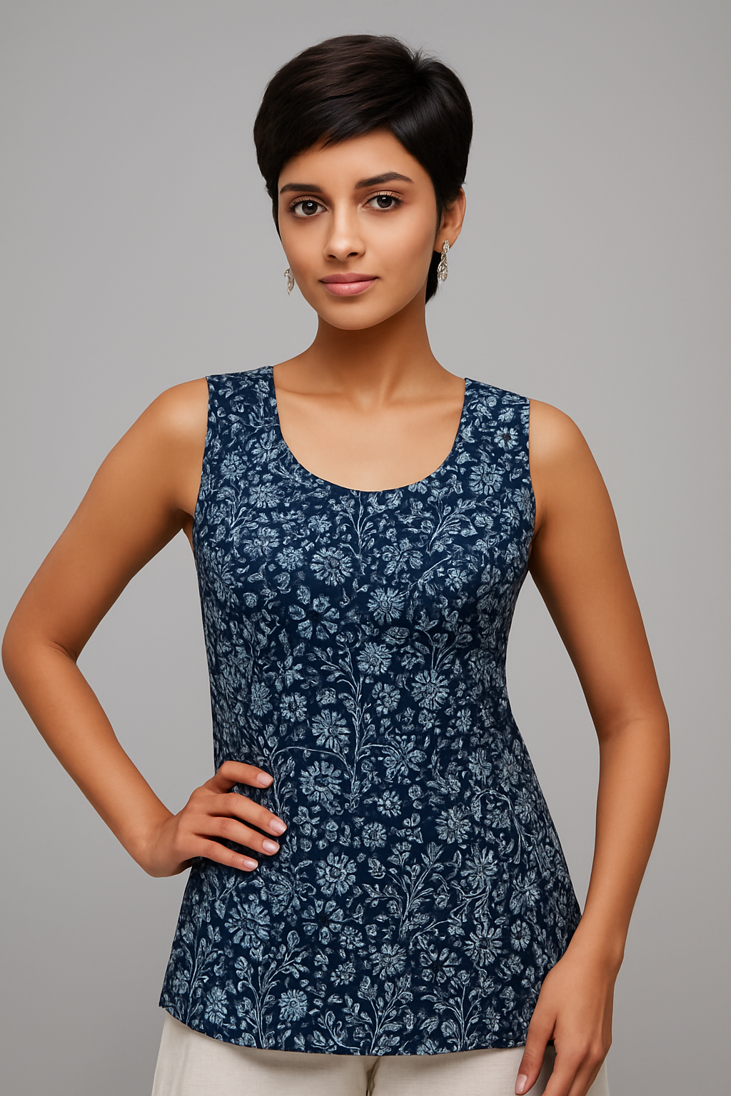 Navy Blue Sleeveless Floral Printed Cotton Kurti