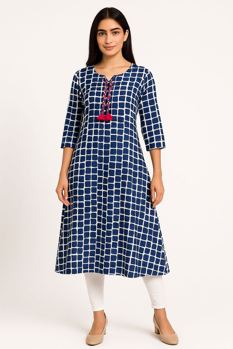 Navy Blue & White Printed A-Line Cotton Kurti for Women – 3/4 Sleeves, V-Neck with Tassel Tie-Up