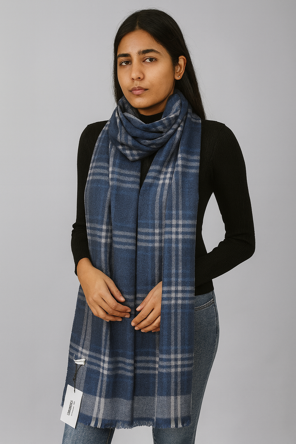Navy Blue Woollen Check Stole for Women | Soft Warm Winter Scarf by Natural Fab