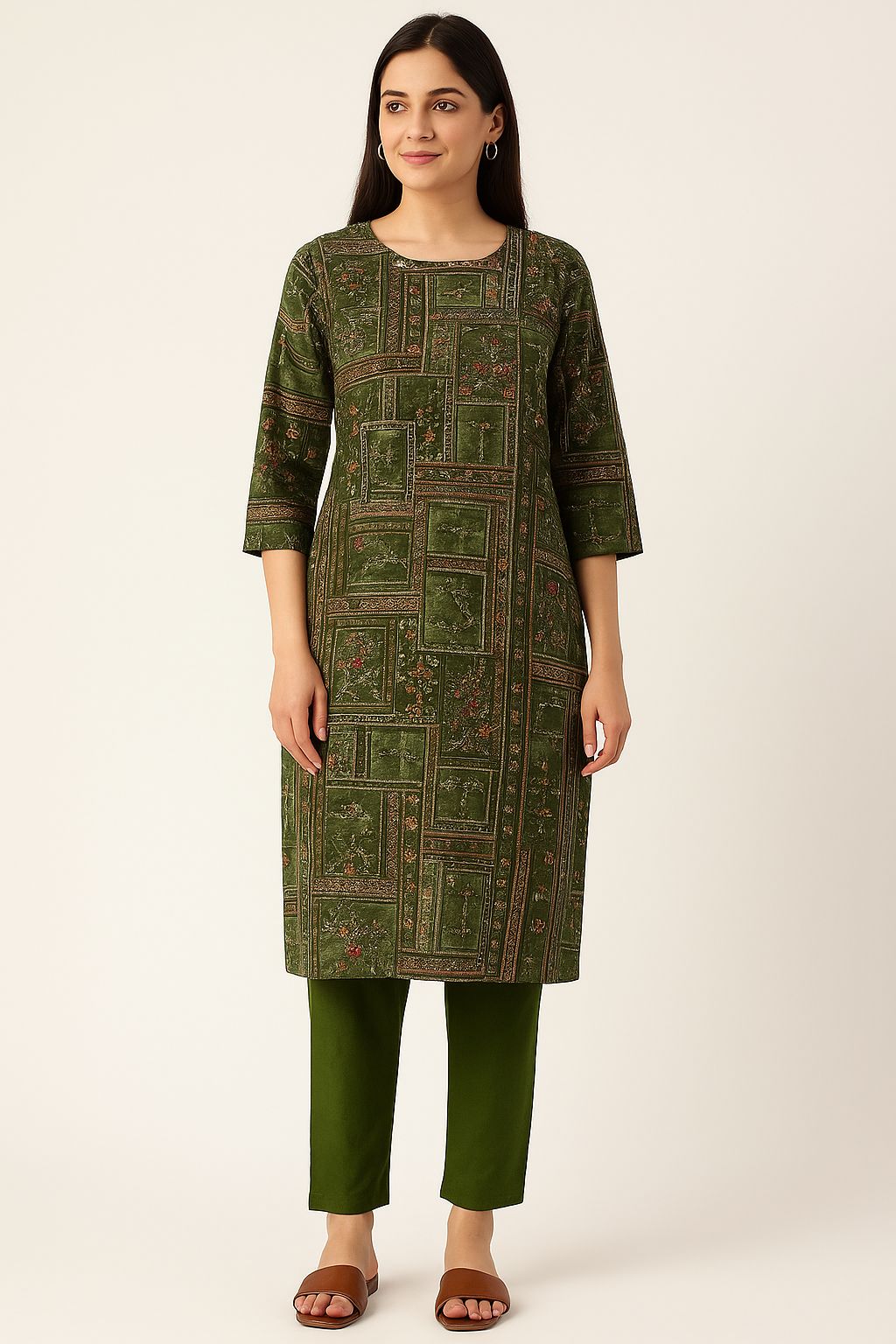 Olive Green Khata Work Cotton Kurti Set with Straight Pants – Natural Fab