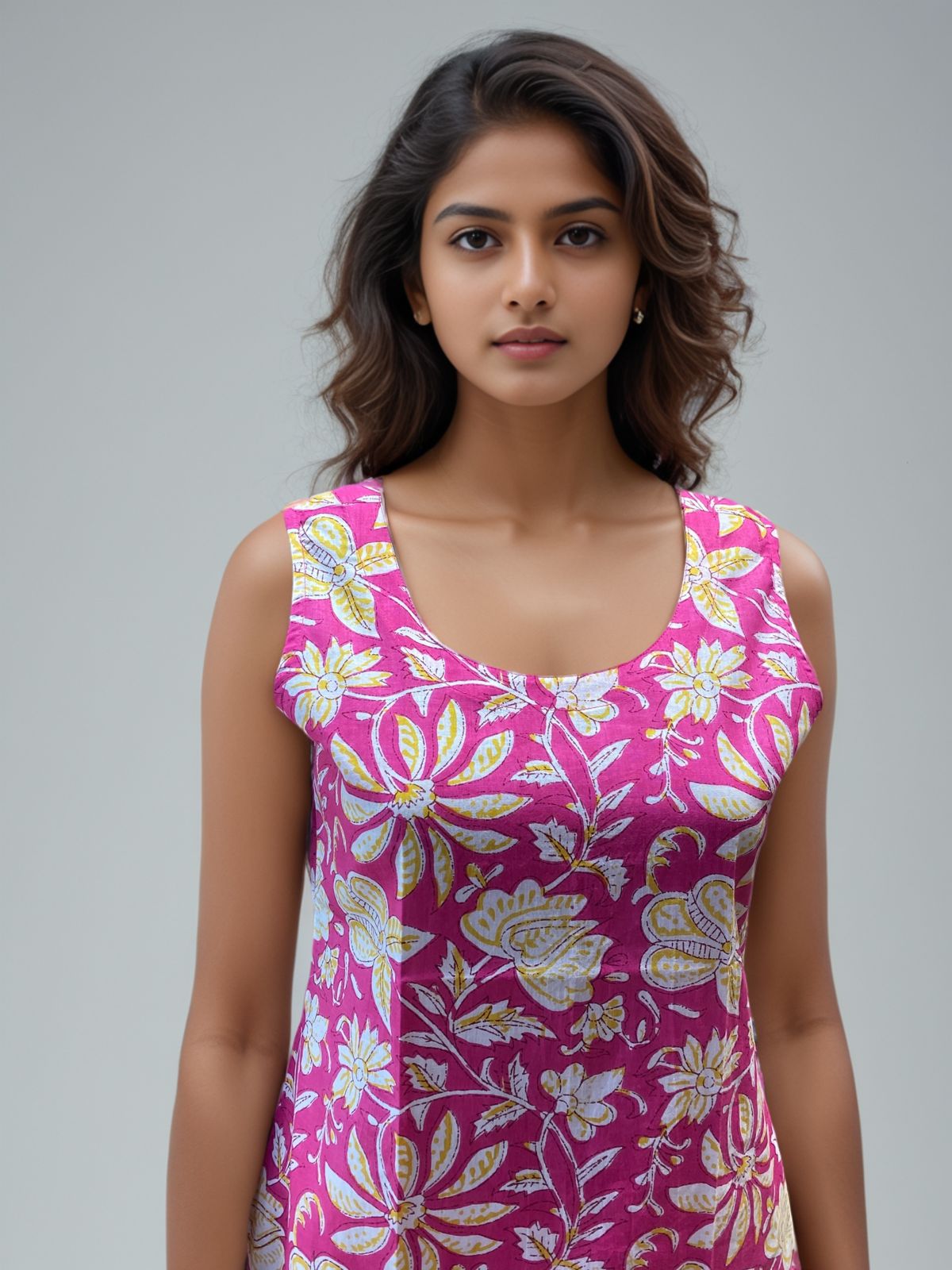 Pink Sleeveless Floral Embroidered Cotton Kurti