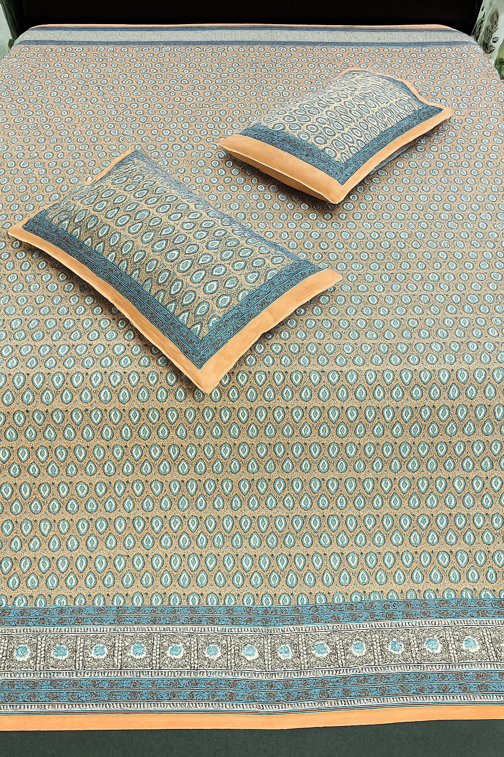 Premium Cotton Double Bedsheet with Pillow Covers – Beige & Blue Ethnic Print | Size 100x108 Inches