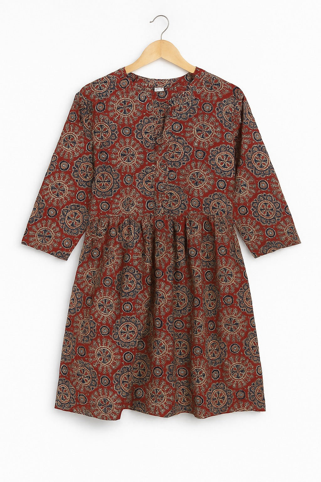 Add a burst of color and culture to your everyday wardrobe with this beautifully handcrafted red cotton kurti by Natural Fab. Made from soft breathable cotton, this short kurta features intricate hand block prints in a symmetrical floral mandala pattern, delivering ethnic charm with modern comfort. The straight-fit silhouette, three-quarter sleeves, and pleated waist design make it a perfect choice for casual outings, office wear, or festive gatherings. Pair it effortlessly with jeans, leggings, or straight pants for a stylish Indo-western look.