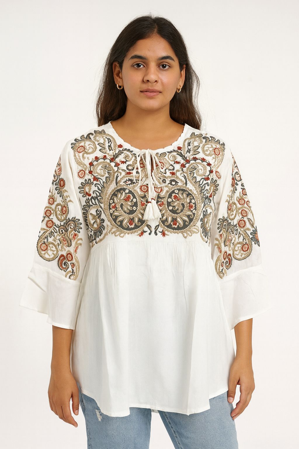 Embrace timeless elegance with this white cotton hand-embroidered top for women, featuring exquisite multicolor thread embroidery in earthy tones on the yoke and sleeves. Designed with a round neckline and tassel tie-up, this top beautifully blends ethnic artistry with modern comfort. The 3/4 flared sleeves and flowy silhouette make it perfect for both festive occasions and everyday wear. Crafted from soft, breathable cotton fabric, this tunic pairs effortlessly with jeans, palazzos, or skirts for a sophisticated ethnic-fusion look.