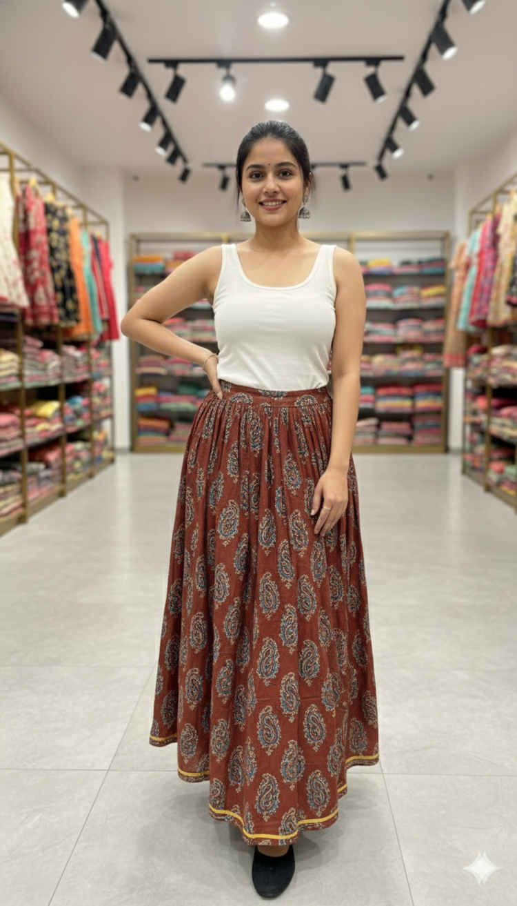 Embrace traditional elegance with this rust brown handblock printed cotton skirt for women, featuring classic paisley motifs that highlight timeless Indian artistry. Crafted from premium breathable cotton, it offers a flowy flared silhouette, golden lace border, and a comfortable waistband perfect for all-day wear. Ideal for festive occasions, vacations, or casual outings — pair it with a white or beige top for a chic ethnic look. Celebrate handcrafted beauty with Natural Fab’s artisanal cotton skirt collection.