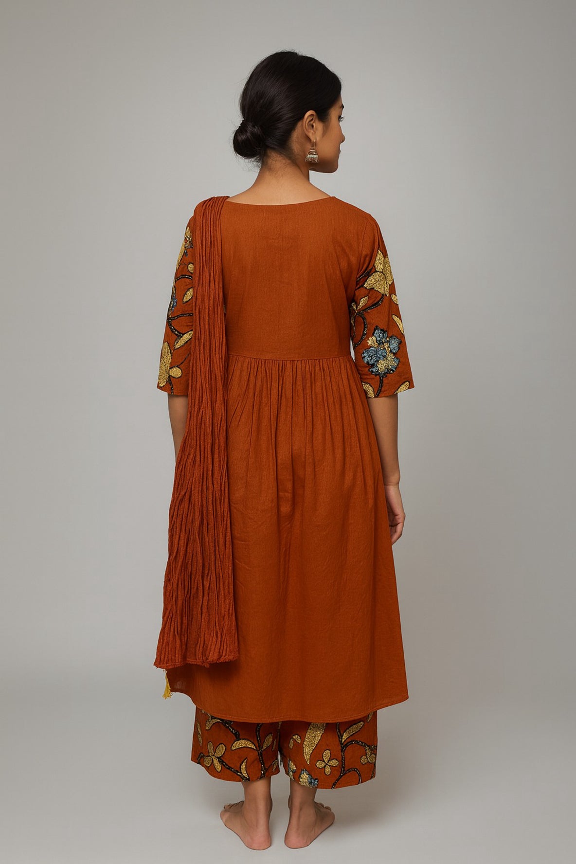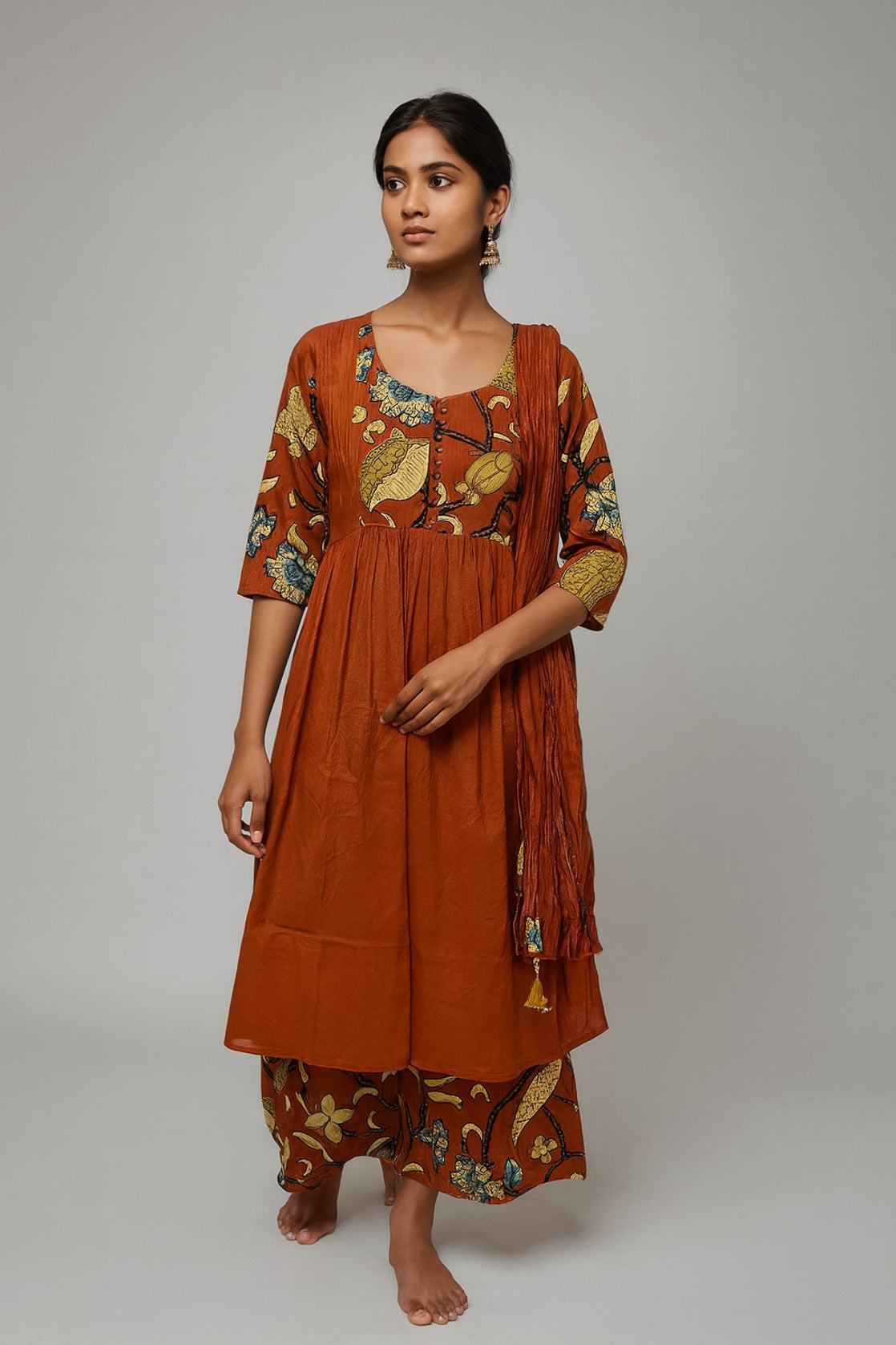 Rust Red Floral Fusion Cotton Kurta Set with Printed Detailing