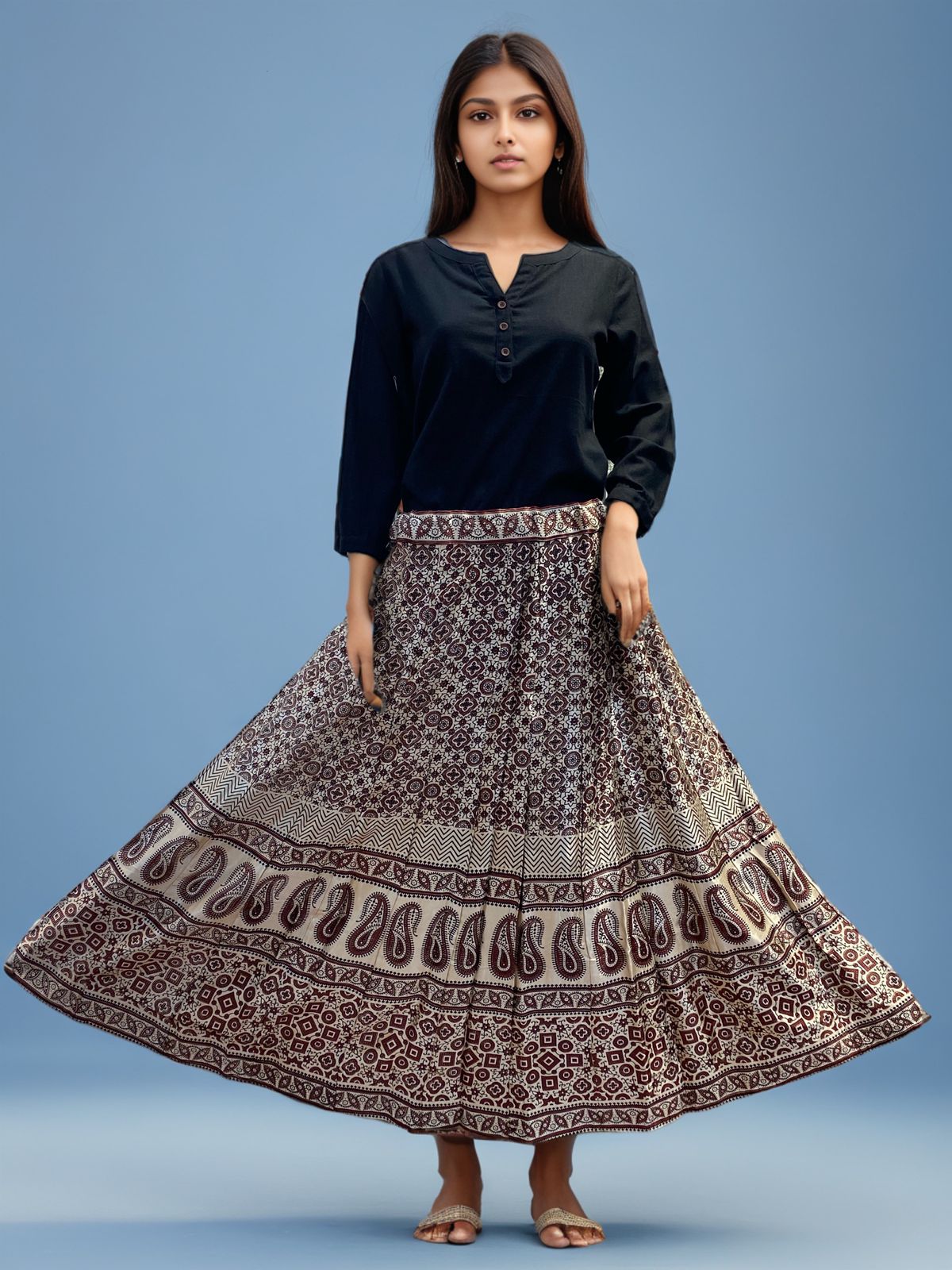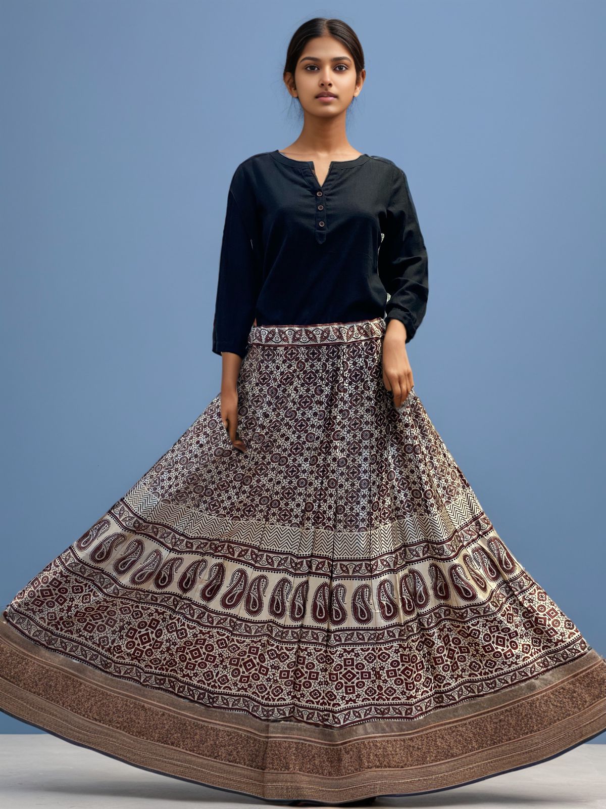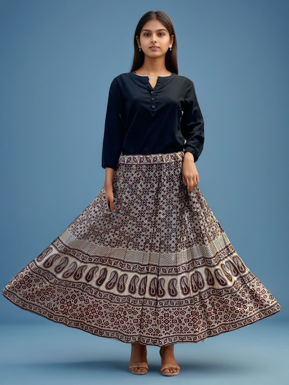 Step into timeless elegance with this beautifully designed Bohemian maxi skirt. Featuring a rich ethnic print in intricate patterns, this skirt is perfect for any casual outing, cultural event, or even a stylish day at work. Crafted from soft, breathable fabric, it ensures all-day comfort while providing a graceful, flowy silhouette. The adjustable waistband makes it a versatile fit for all body types. Pair it with a simple black top or a crop blouse to create a stunning ensemble.