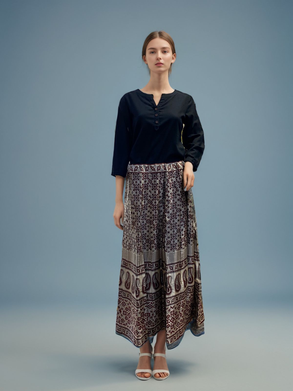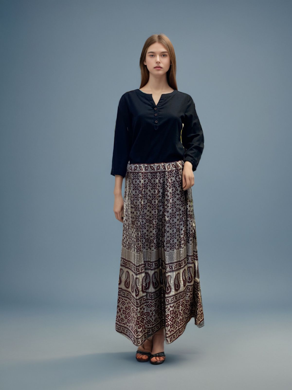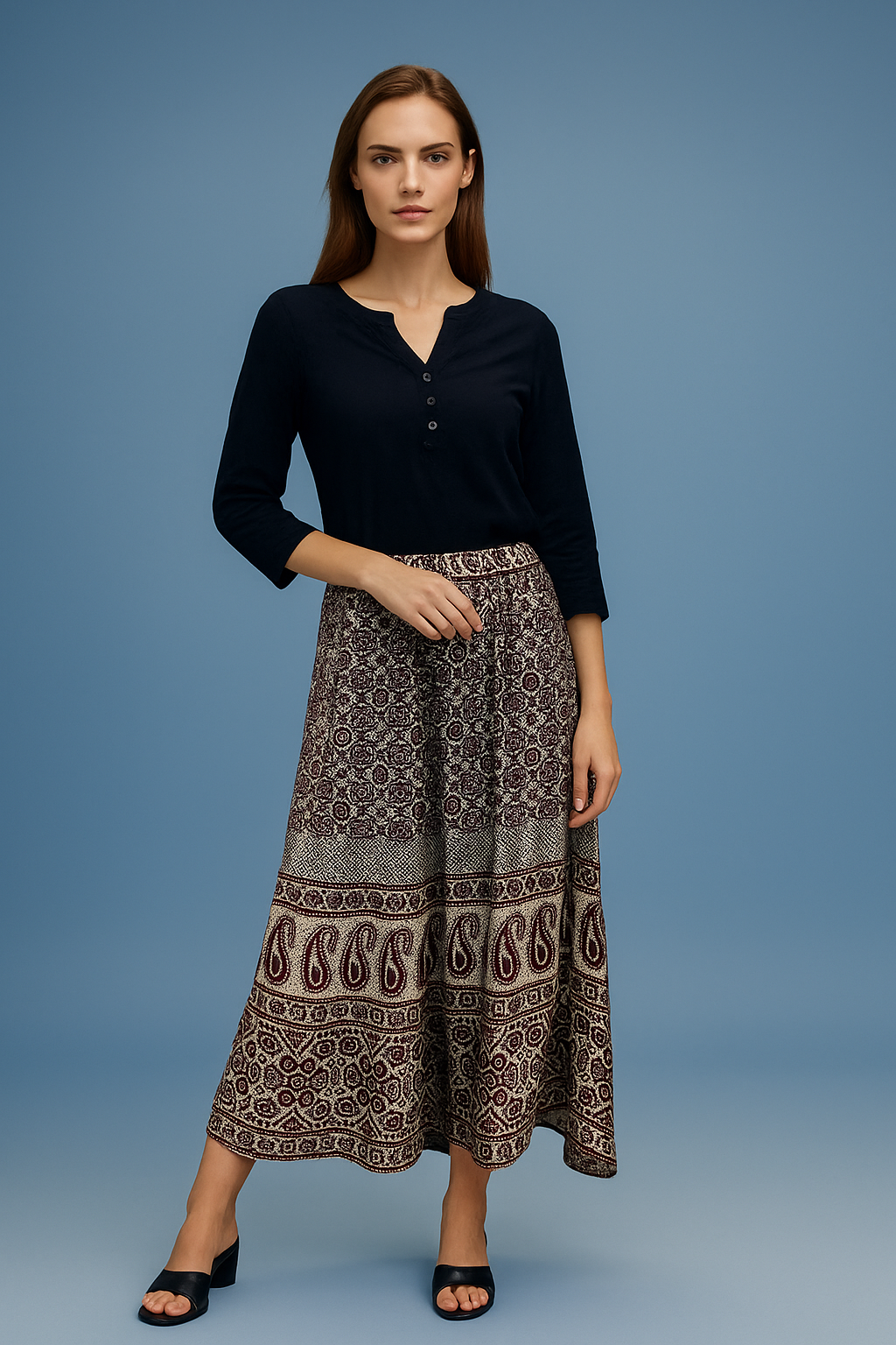 Step into timeless elegance with this beautifully designed Bohemian maxi skirt. Featuring a rich ethnic print in intricate patterns, this skirt is perfect for any casual outing, cultural event, or even a stylish day at work. Crafted from soft, breathable fabric, it ensures all-day comfort while providing a graceful, flowy silhouette. The adjustable waistband makes it a versatile fit for all body types. Pair it with a simple black top or a crop blouse to create a stunning ensemble.