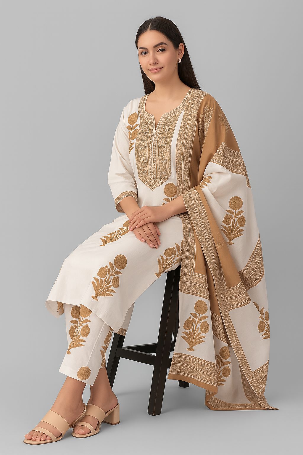 Elevate your ethnic fashion with this elegant 3-piece kurti set crafted from premium quality cotton. The white kurta is adorned with intricate beige floral motifs and detailed embroidery on the yoke, paired with matching printed pants and a beautifully bordered dupatta in complementary tones. Ideal for festive occasions, office wear, or everyday elegance, this ensemble offers breathable comfort and timeless style.