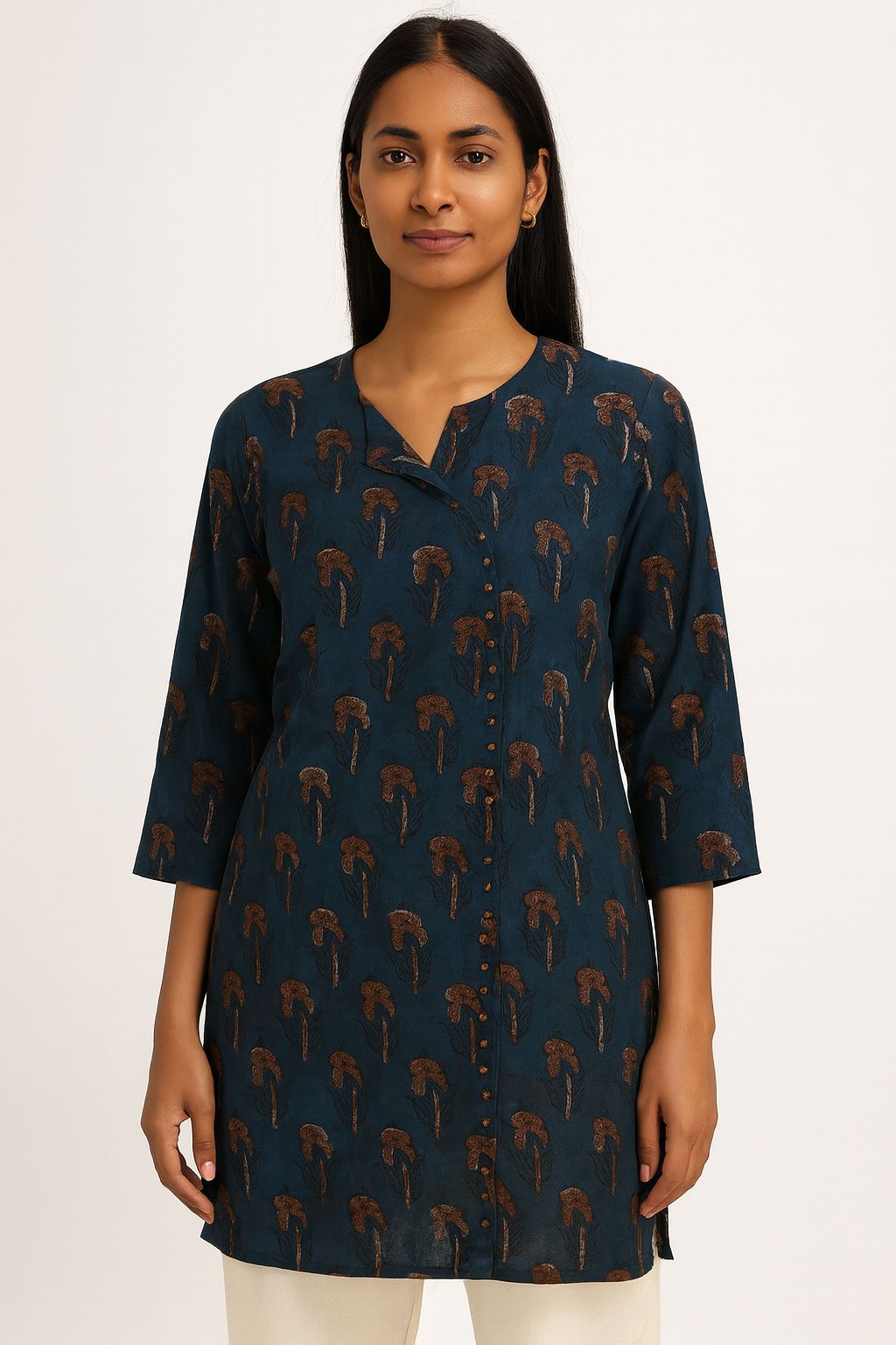 Add a touch of elegance to your everyday style with this navy blue cotton short kurti featuring traditional handblock-inspired prints. Designed with a straight fit, 3/4th sleeves, and button-down detailing on the front, this kurti is perfect for both casual outings and office wear. The breathable cotton fabric ensures comfort while the earthy block prints lend it an artisanal charm.