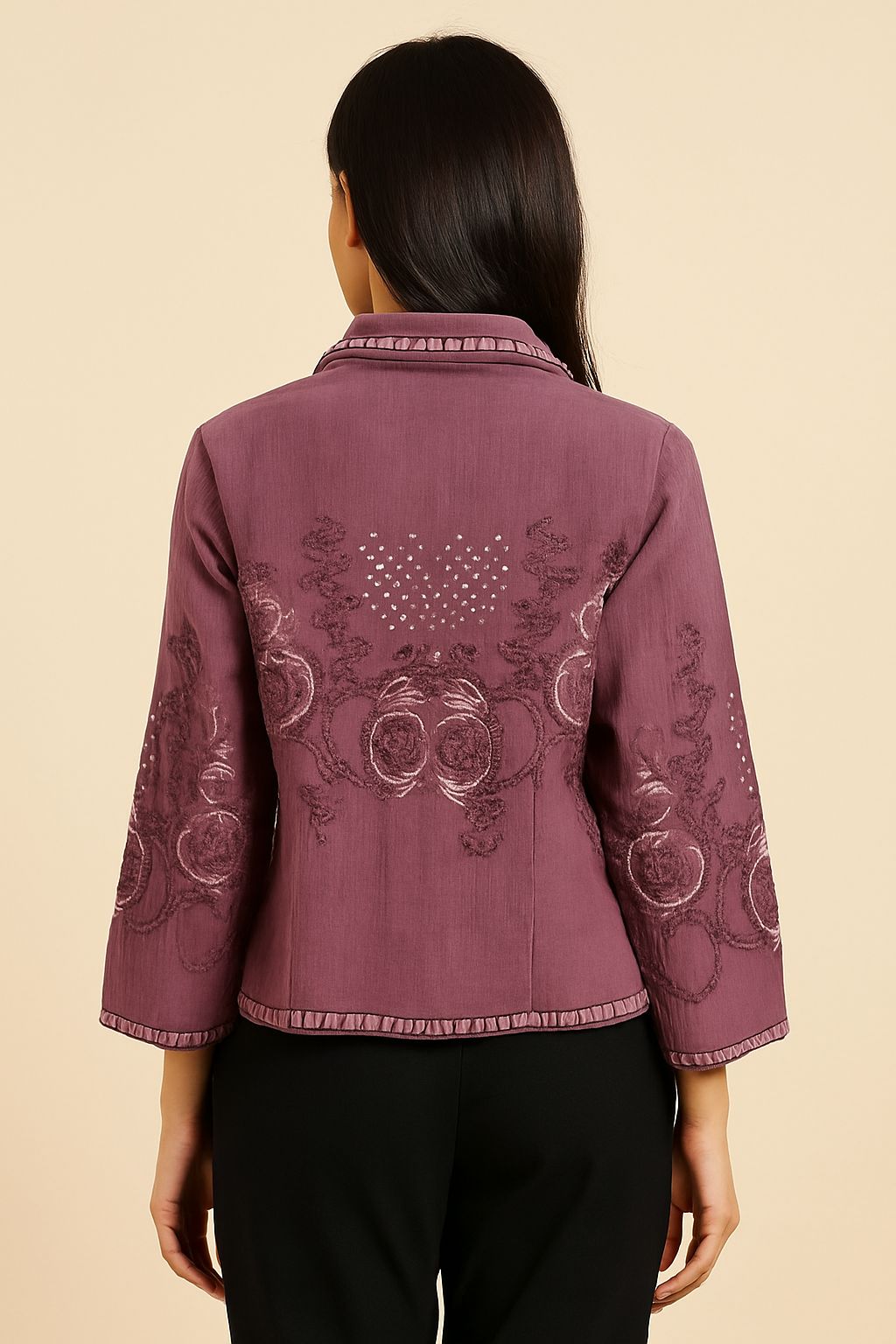 Add a touch of elegance to your wardrobe with this maroon embroidered jacket for women, beautifully designed with intricate thread work and delicate mirror embellishments. Featuring a classic shirt collar, front button closure, and functional pockets, this ethnic short jacket blends traditional charm with modern versatility. Crafted from comfortable fabric, it pairs effortlessly with kurtis, dresses, or even western wear for a chic Indo-fusion look. Perfect for festivals, parties, office wear, and casual outings, this jacket is a timeless addition to your ethnic and contemporary collection.