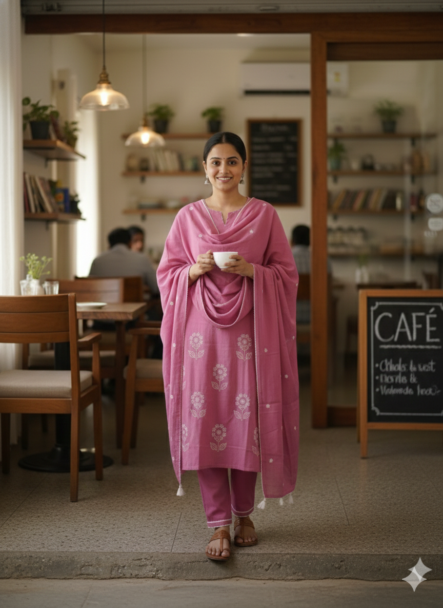 Add elegance to your everyday ethnic look with this beautiful Pink Cotton Embroidered Kurti Set. Crafted from soft, breathable cotton, this 3-piece suit set includes a delicately embroidered kurti, matching pants, and a lightweight embroidered dupatta. The charming white thread motifs give it a fresh, graceful appeal—perfect for summer wear, office, college, casual outings, and festive gatherings.