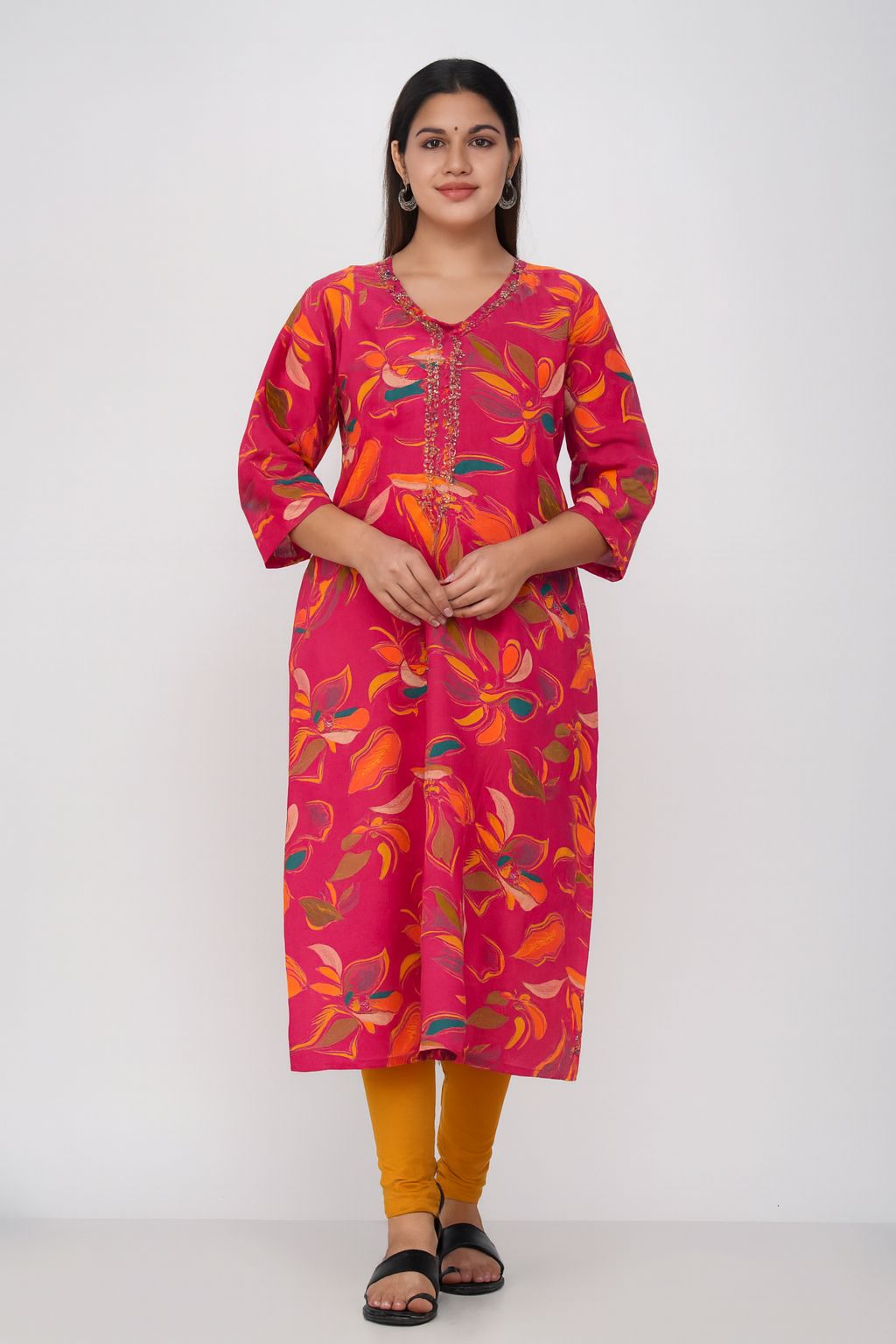 Brighten up your ethnic wardrobe with this elegant pink floral printed kurti for women, crafted from soft and breathable cotton fabric. Designed in a straight fit silhouette, it features a stylish V-neckline with delicate embroidery detailing that adds a festive charm. The vibrant floral print in bold hues makes it a perfect pick for both casual and special occasions. Pair it with leggings, palazzos, or pants for a versatile look that transitions effortlessly from office wear to festive gatherings. A must-have kurti that blends comfort with contemporary ethnic style.