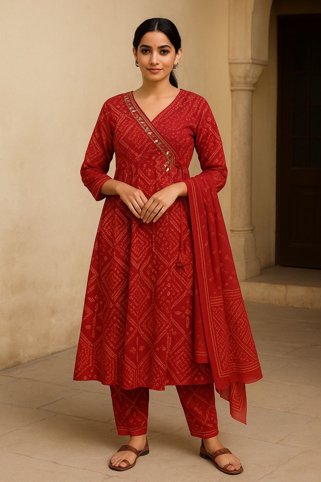 Elevate your ethnic style with this stunning red printed Anarkali kurti set for women, designed with intricate ethnic patterns and crafted from soft, breathable cotton fabric. The set includes a flared V-neck kurti with mirror-work detailing, matching straight pants, and a coordinating dupatta, making it a complete festive-ready outfit. Perfect for festivals, weddings, parties, or casual gatherings, this kurti set combines traditional elegance with modern comfort. Pair it with statement jewelry and sandals for a graceful ethnic look.