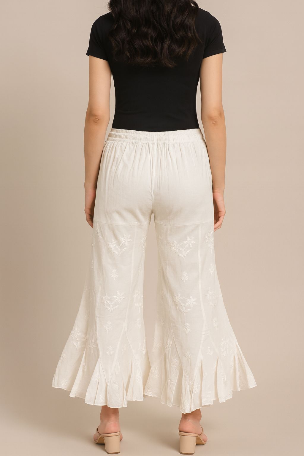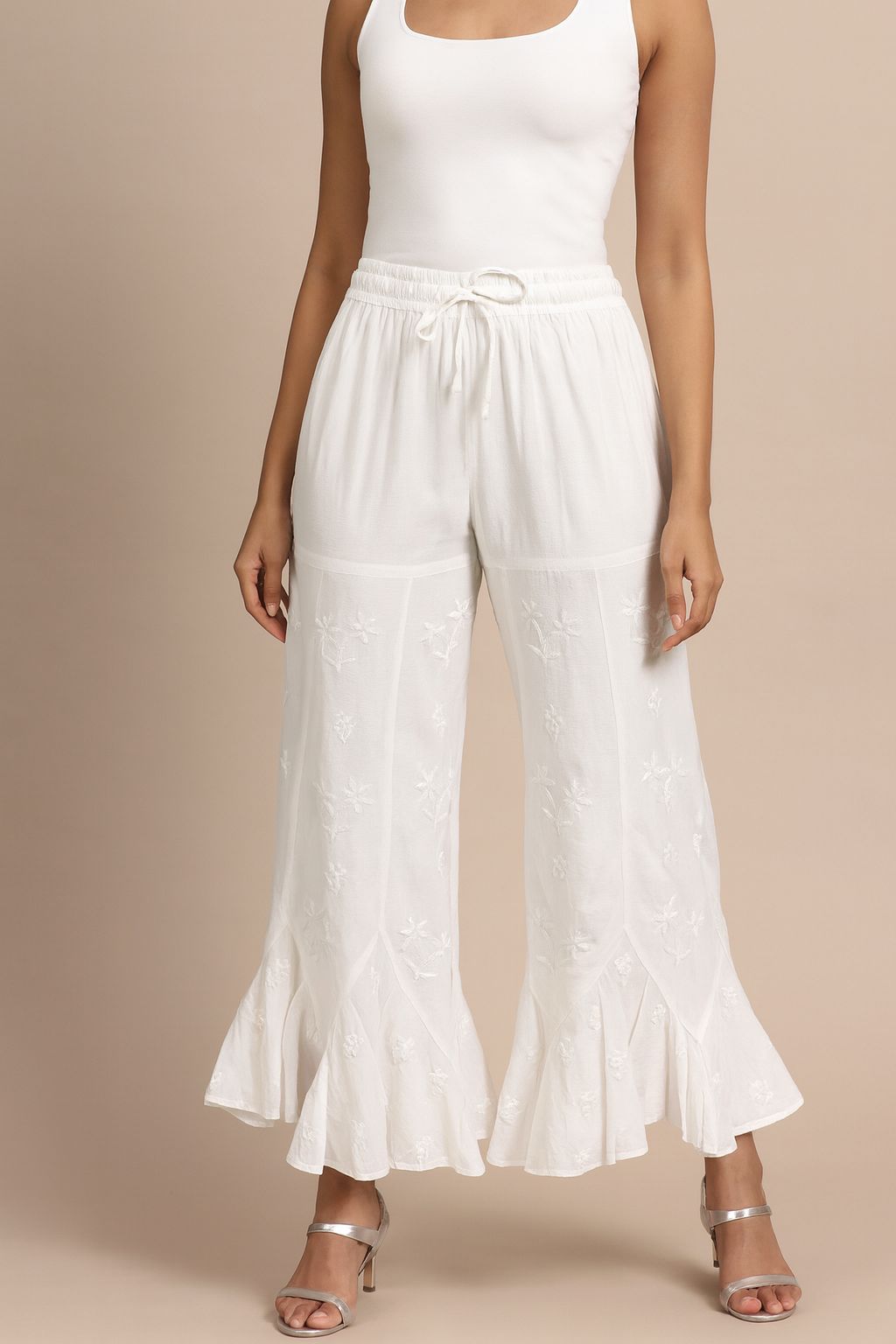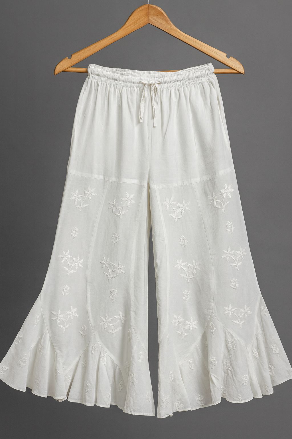 Women’s White Chikankari Sharara Pants – Embroidered Flared Palazzo with Drawstring Waist