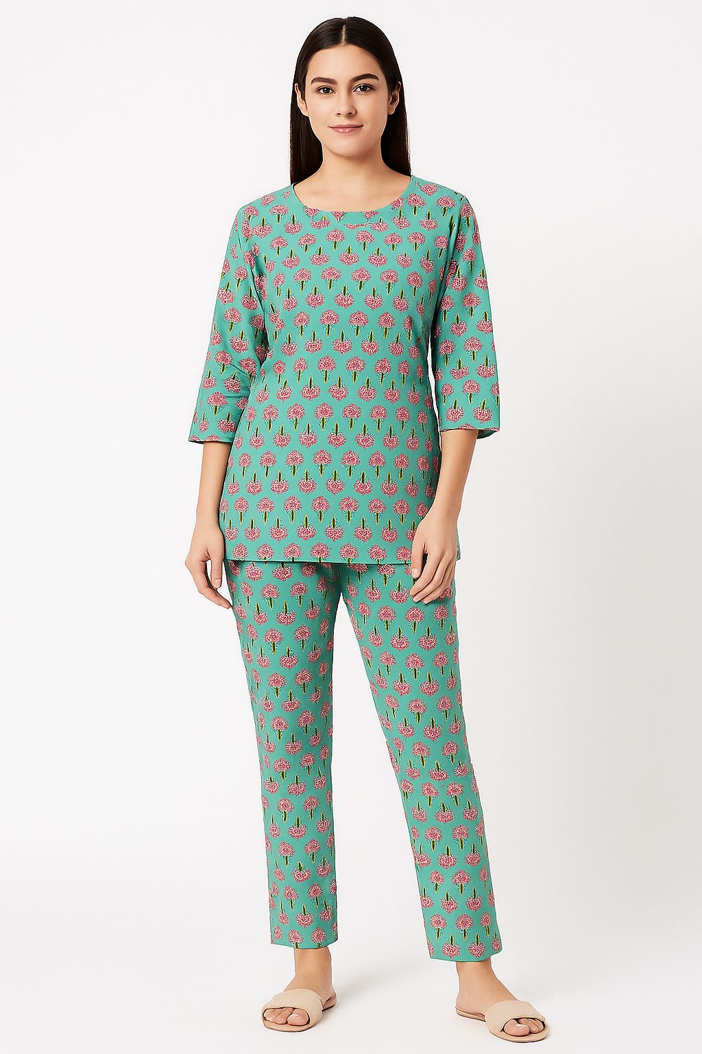 Women's Green Cotton Printed Co-ord Set with Floral Handblock Motif – Stylish & Comfortable Loungewear