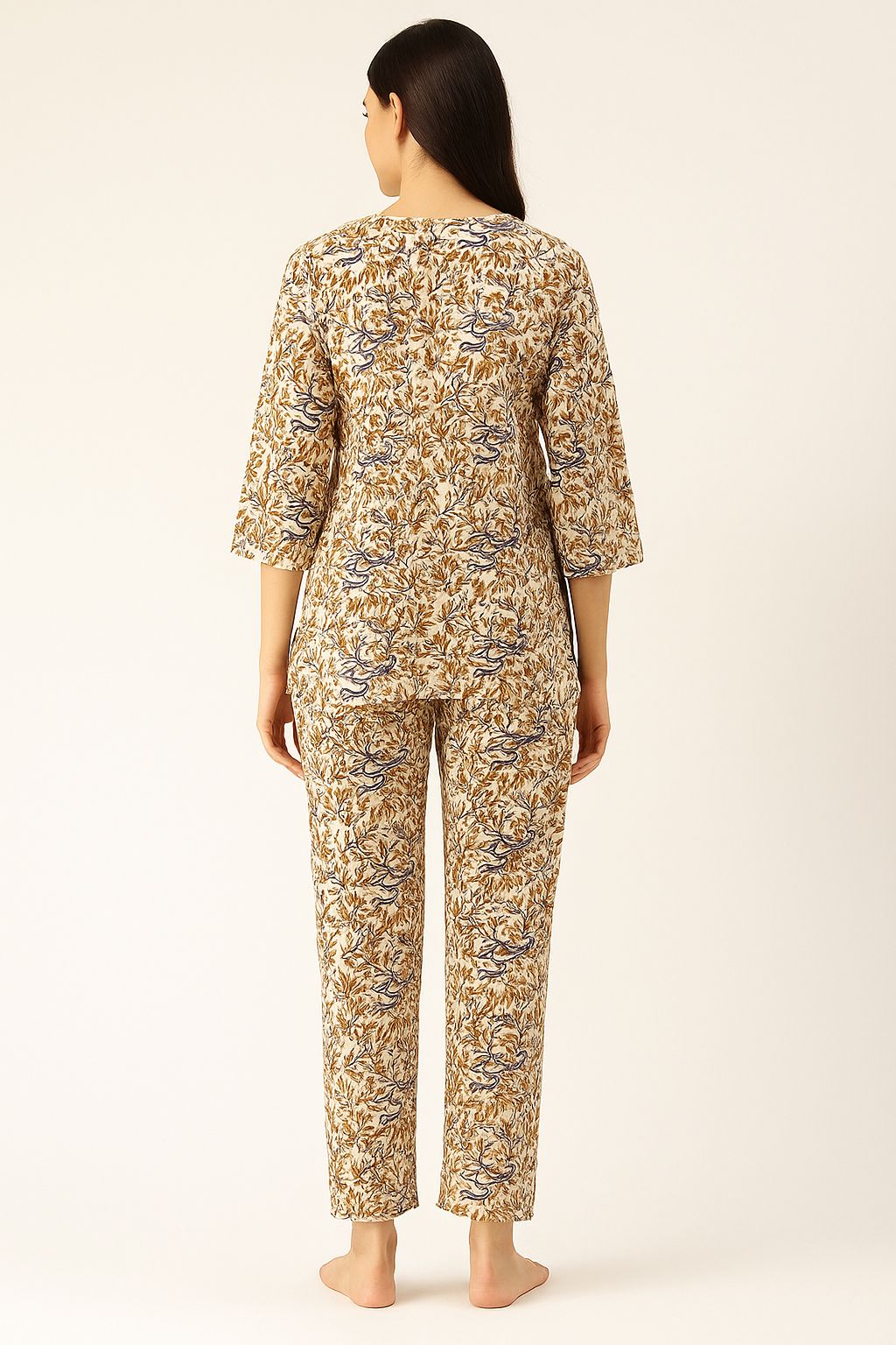 Experience unmatched comfort with this stylish cotton night suit set, featuring a rich mustard base adorned with handblock-inspired blue floral vine motifs. The soft cotton fabric keeps you cool and cozy through the night, while the smart 3/4th sleeve top and straight-fit pants offer relaxed ease of movement. Perfect for lounging, sleeping, or unwinding in style, this set brings a touch of heritage print to your everyday routine.
