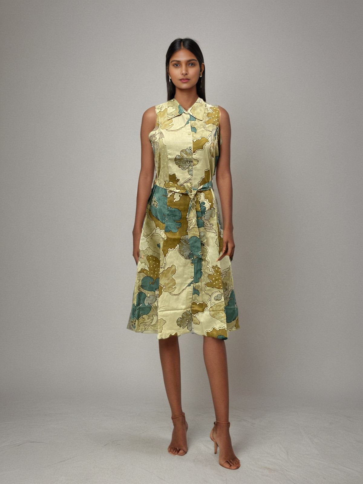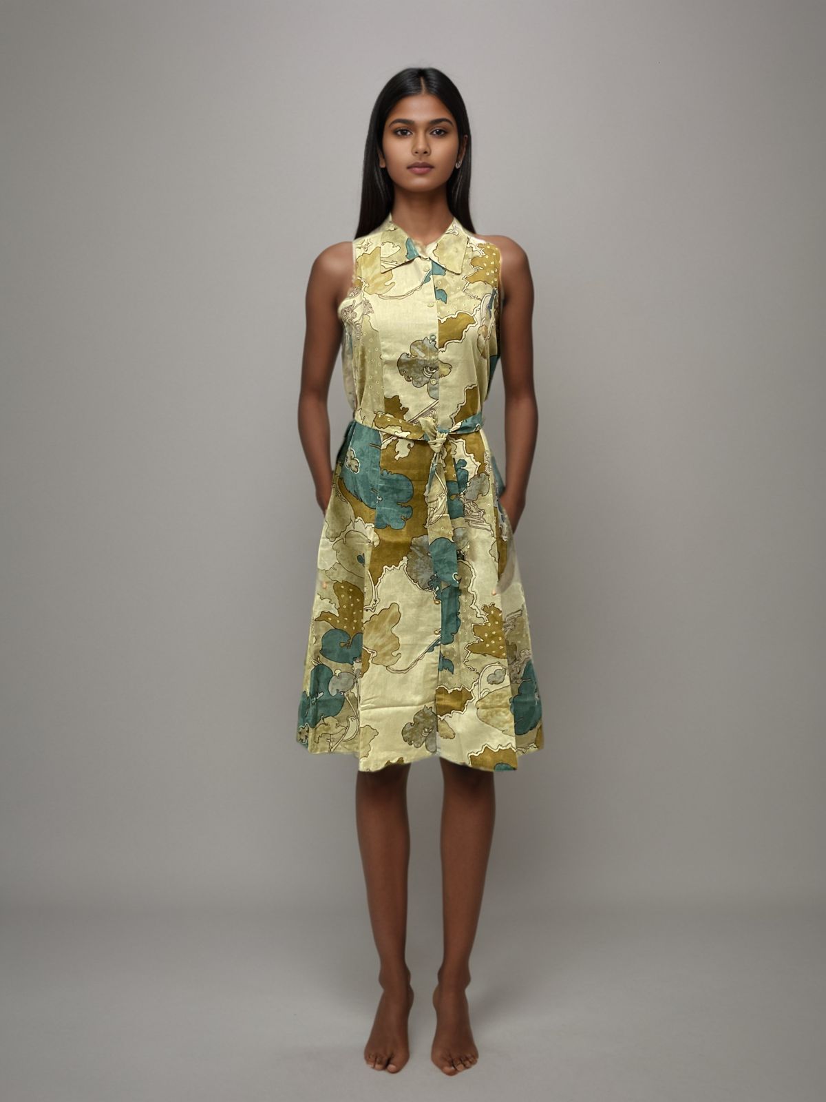 Elevate your summer wardrobe with this elegant sleeveless floral shirt dress. Crafted from a smooth, satin-finish fabric, this knee-length dress features a charming blend of earthy yellow, green, and blue hues in a bold floral print. The collared neckline and button-down front add a smart, tailored touch, while the tie-up waistbelt enhances your silhouette for a flattering fit. Perfect for brunches, vacations, casual office wear, or weekend outings, this dress blends comfort with timeless style.